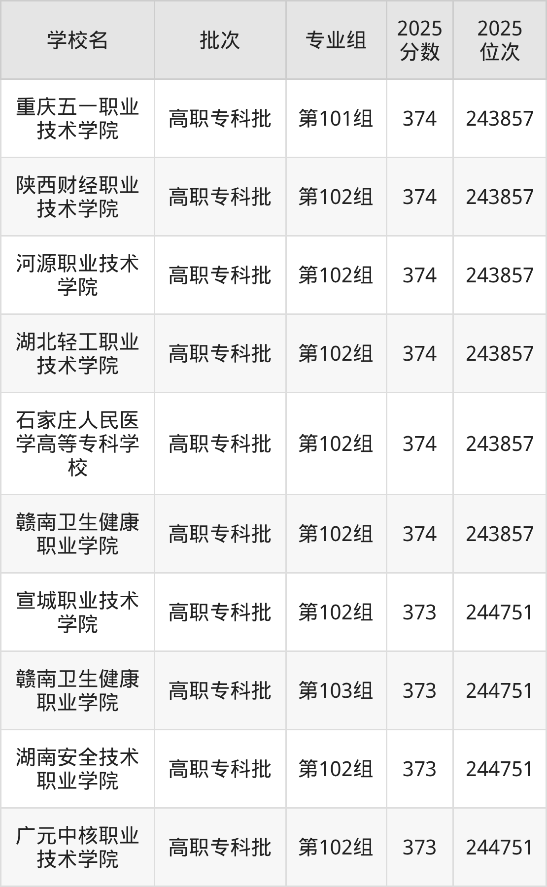 2025年湖南高考物理类373分(243858名~244751名)能上的大学有宣城职业技术学院第102组、赣南卫生健康职业学院第103组、湖南安全技术职业学院第102组、广元中核职业技术学院第102组。
