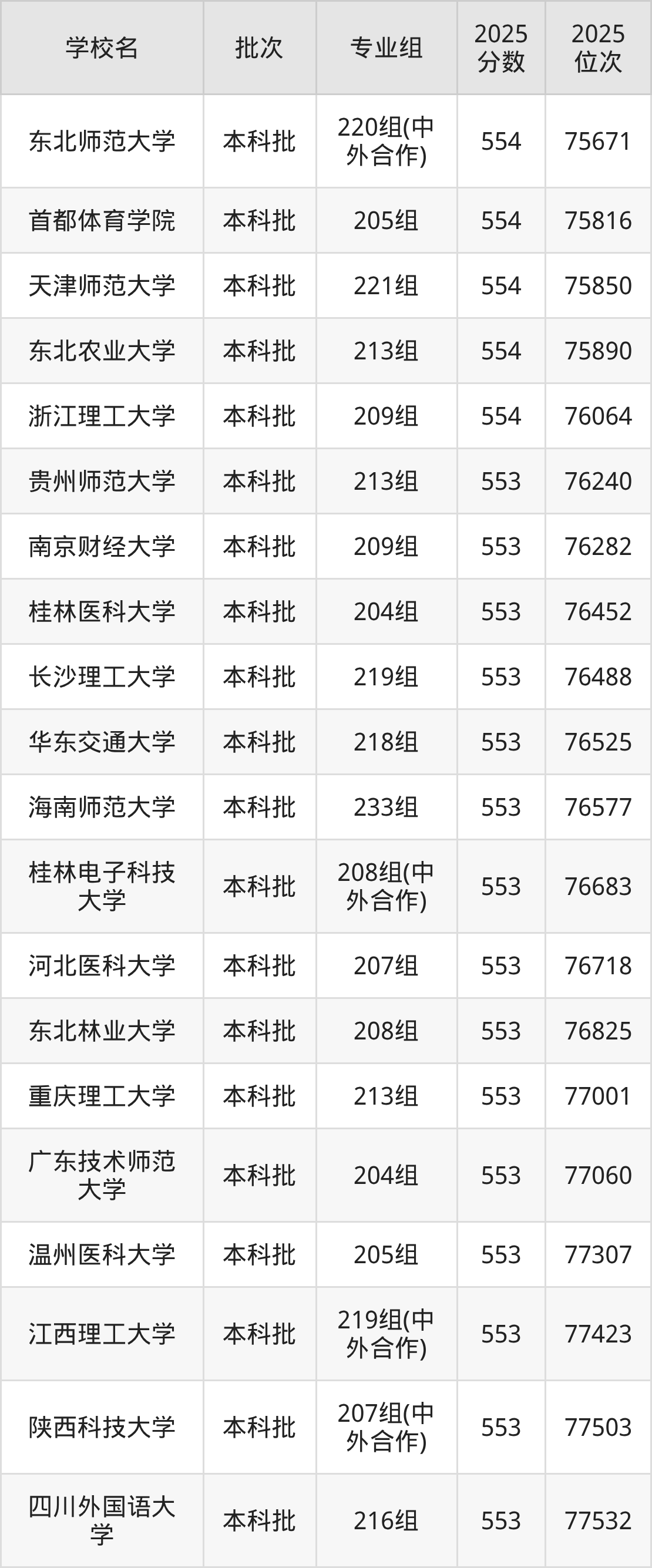 2025年广东高考物理类553分(76148名~77554名)能上的大学有河北医科大学207组、东北林业大学208组、南京财经大学209组、温州医科大学205组等。