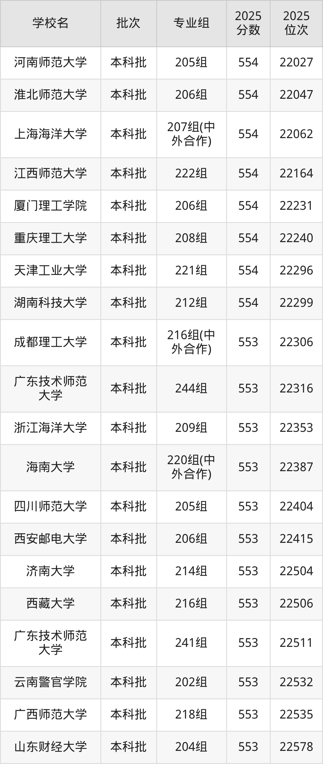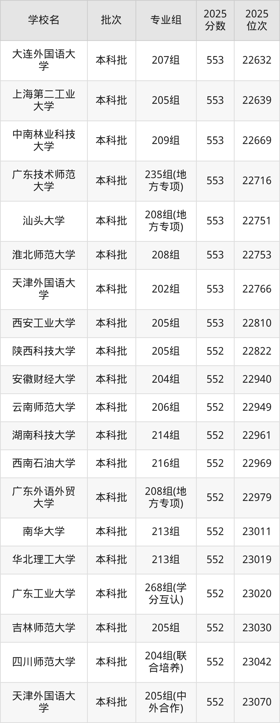 2025年广东高考历史类553分(22301名~22812名)能上的大学有天津外国语大学202组、大连外国语大学207组、浙江海洋大学209组、淮北师范大学208组等。