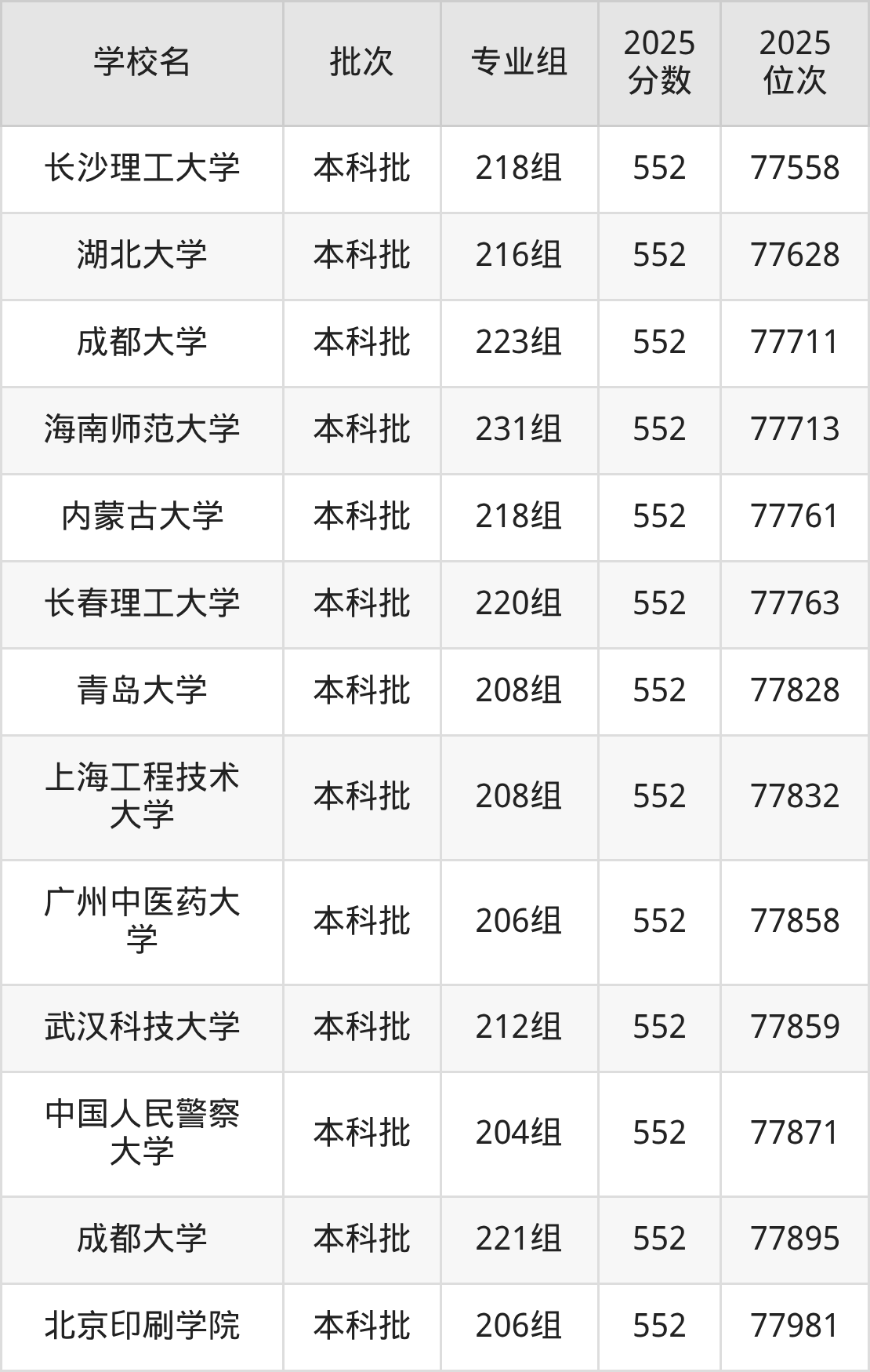 另外录取位次低于该区间(较稳妥)的有长沙理工大学218组(77558名)、湖北大学216组(77628名)等;录取位次高于该区间(可冲)的有浙江理工大学209组(76064名)、东北农业大学213组(75890名)等。