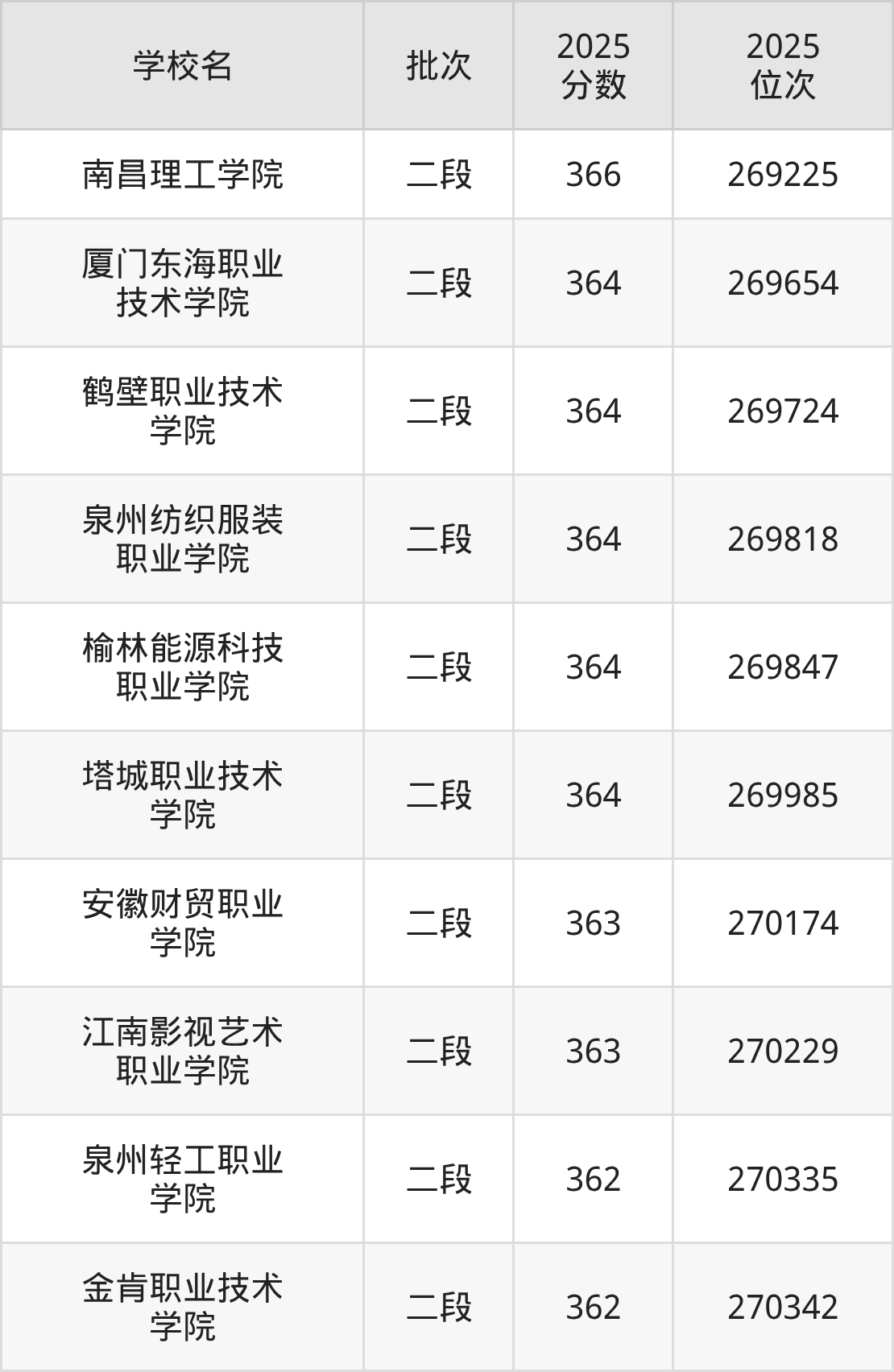2025年浙江高考364分(269639名~269985名)能上的大学有泉州纺织服装职业学院、榆林能源科技职业学院、塔城职业技术学院、鹤壁职业技术学院等。