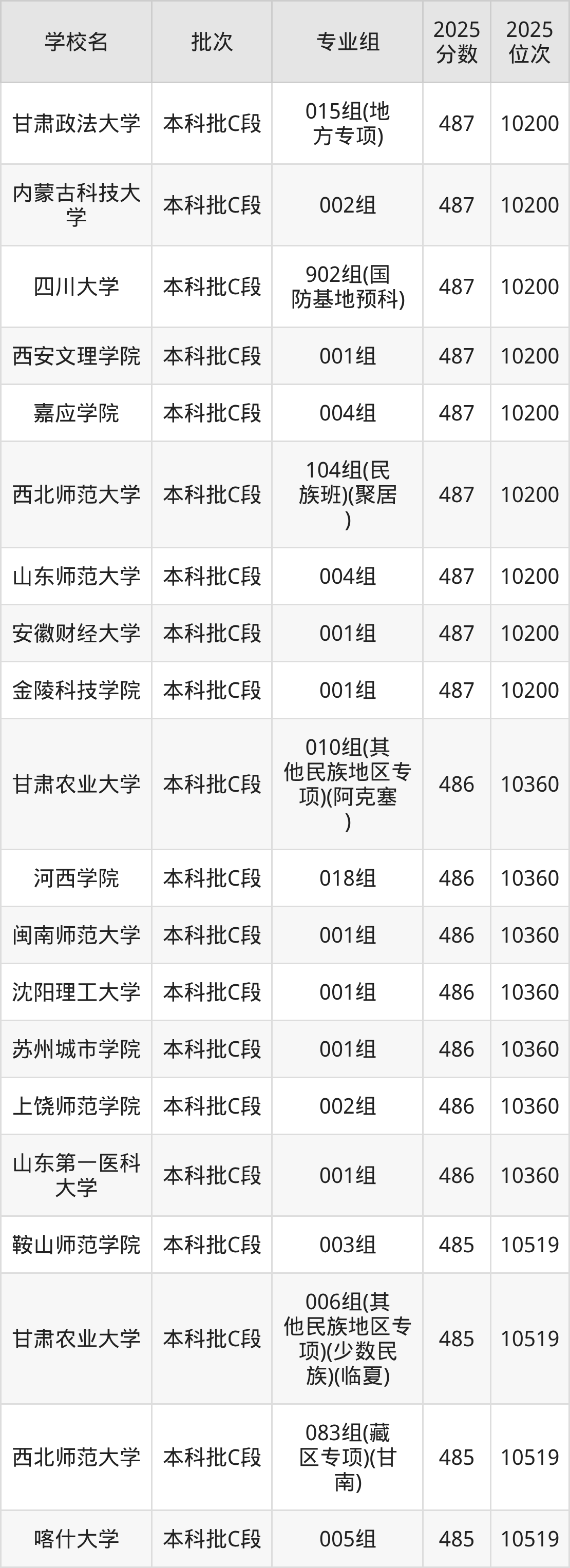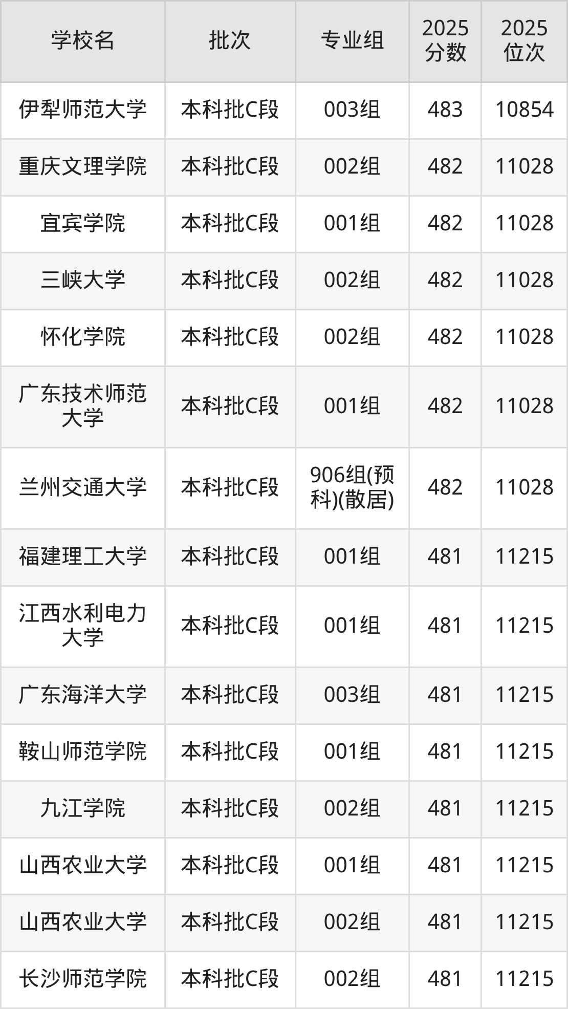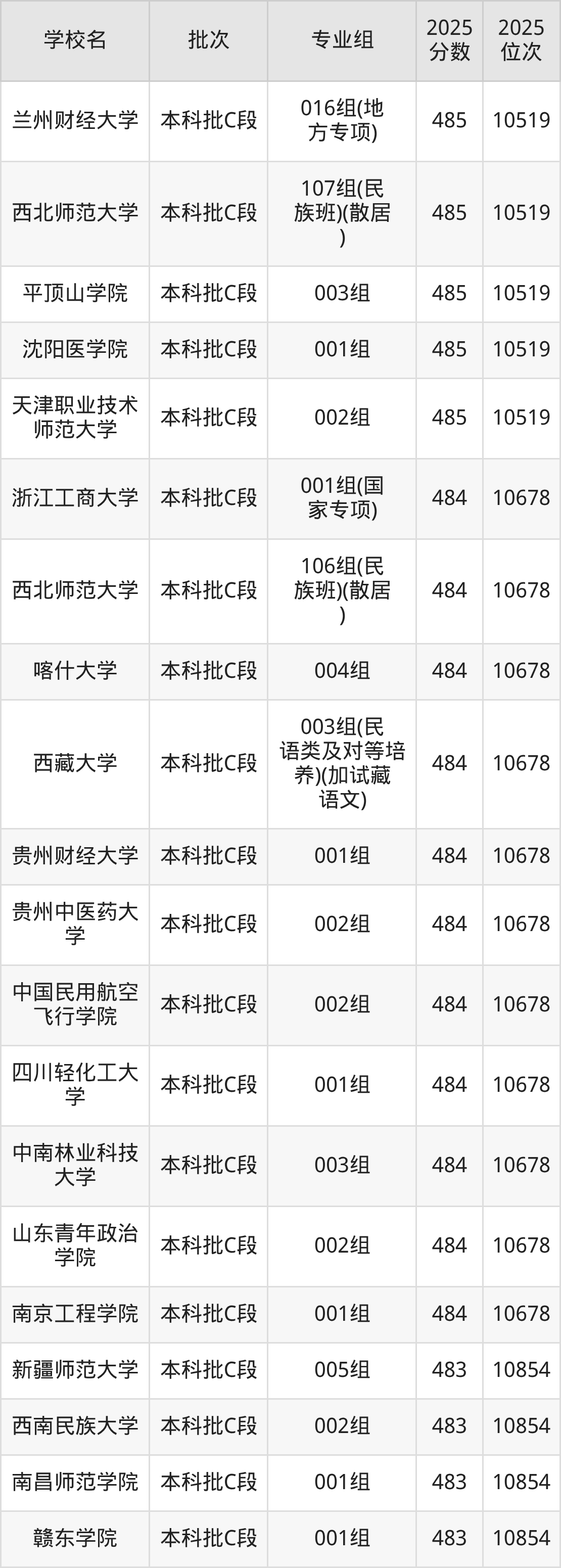 2025年甘肃高考历史类483分(10679名~10854名)能上的大学有赣东学院001组、南昌师范学院001组、西南民族大学002组、新疆师范大学005组等。