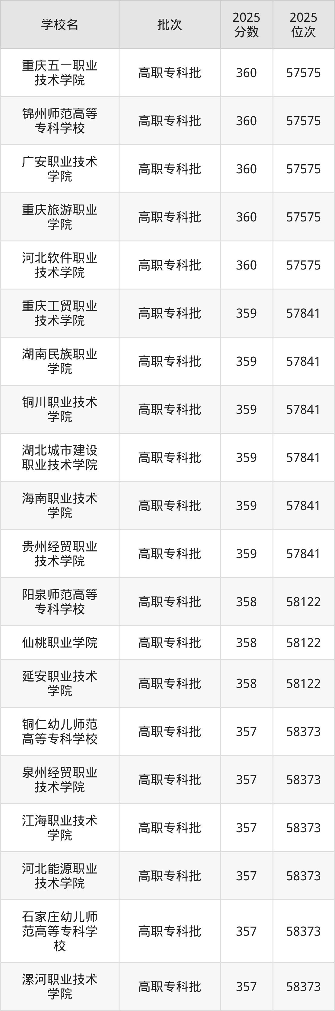 2025年重庆高考历史类358分(57842名~58122名)能上的大学有阳泉师范高等专科学校、延安职业技术学院、仙桃职业学院。
