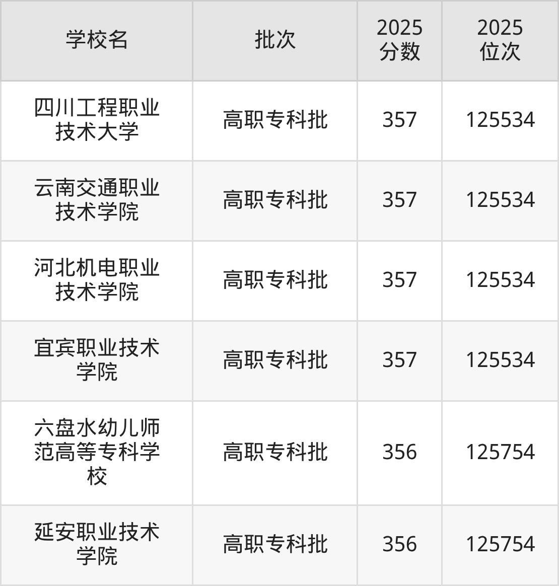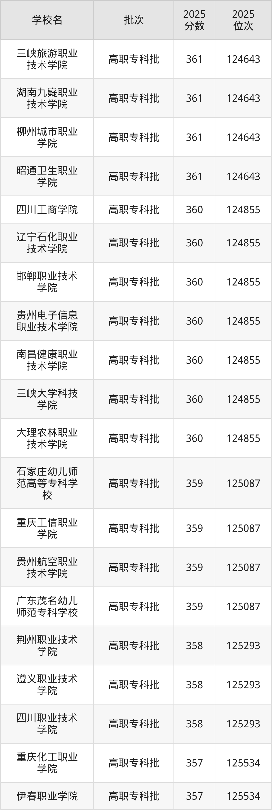 2025年重庆高考物理类358分(125088名~125293名)能上的大学有四川职业技术学院、遵义职业技术学院、荆州职业技术学院。