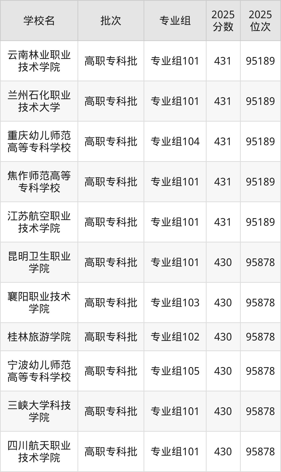 2025年四川高考历史类430分(95190名~95878名)能上的大学有桂林旅游学院专业组102、宁波幼儿师范高等专科学校专业组105、三峡大学科技学院专业组101、昆明卫生职业学院专业组101等。
