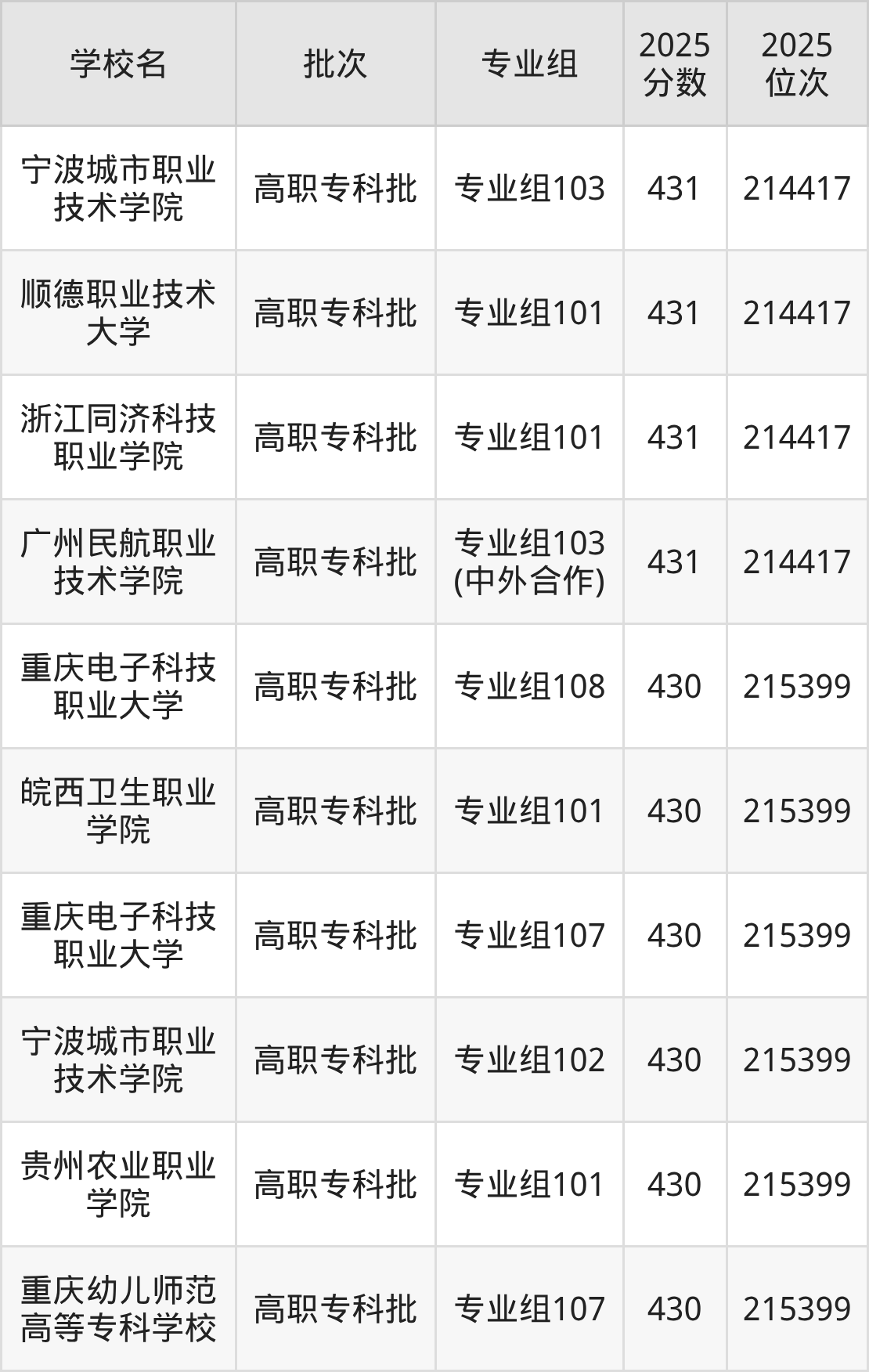 2025年四川高考物理类430分(214418名~215399名)能上的大学有贵州农业职业学院专业组101、重庆幼儿师范高等专科学校专业组107、皖西卫生职业学院专业组101、重庆电子科技职业大学专业组108等。