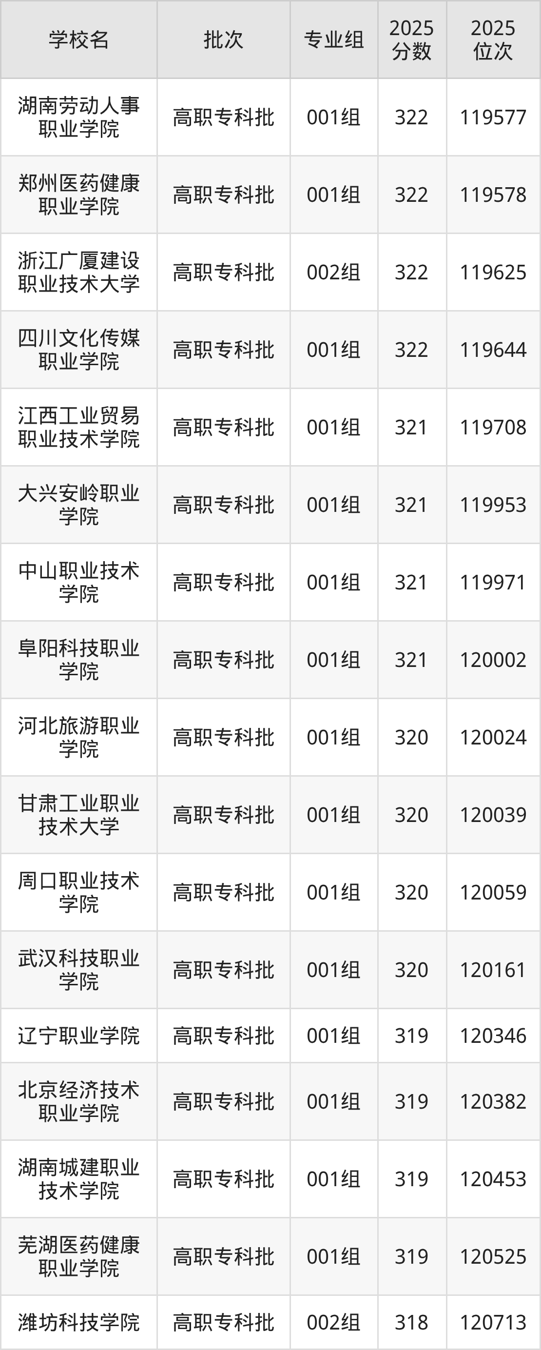 2025年安徽高考历史类320分(120008名~120316名)能上的大学有甘肃工业职业技术大学001组、河北旅游职业学院001组、武汉科技职业学院001组、周口职业技术学院001组。