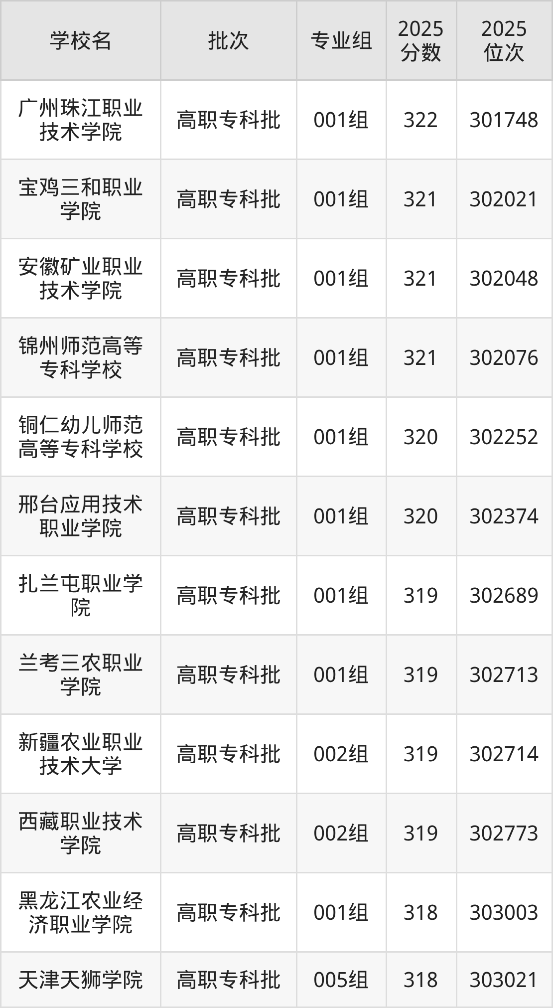另外录取位次低于该区间(较稳妥)的有扎兰屯职业学院001组(302689名)、兰考三农职业学院001组(302713名)等;录取位次高于该区间(可冲)的有锦州师范高等专科学校001组(302076名)、安徽矿业职业技术学院001组(302048名)等。