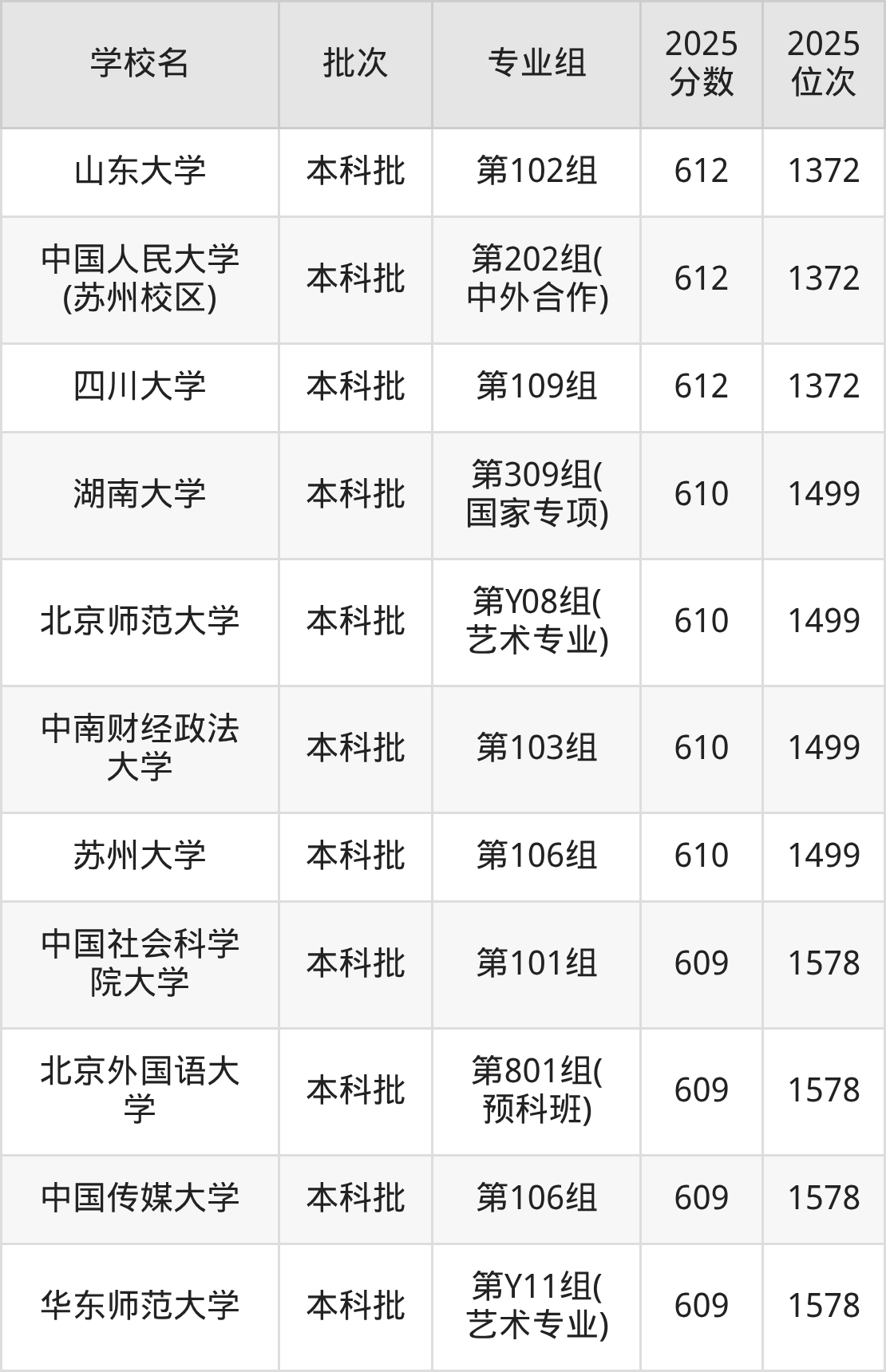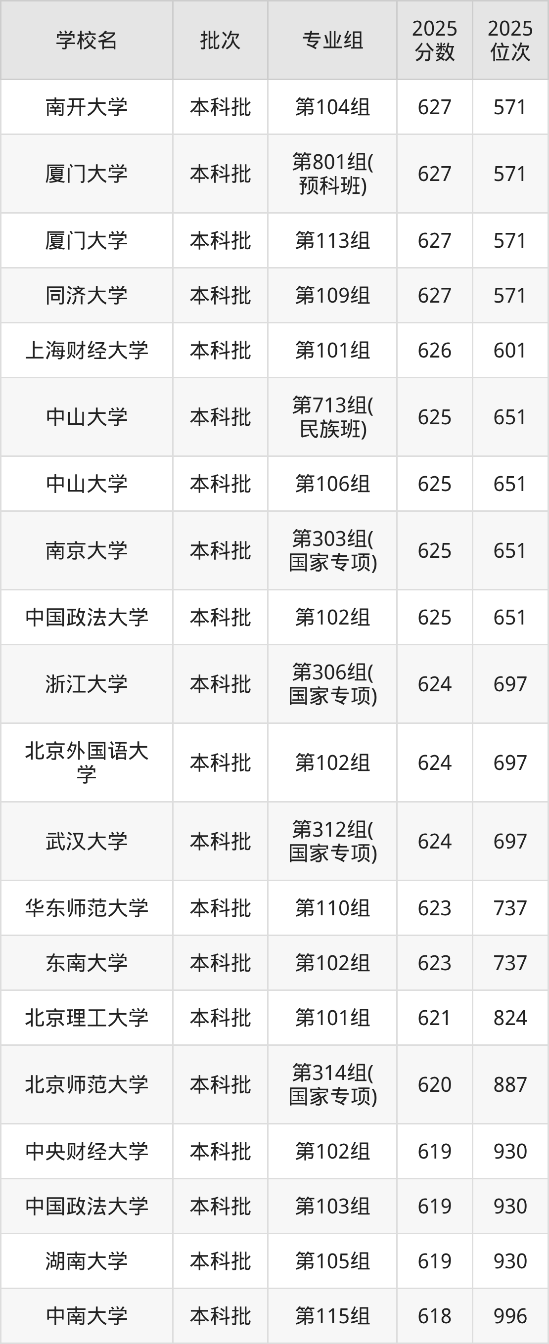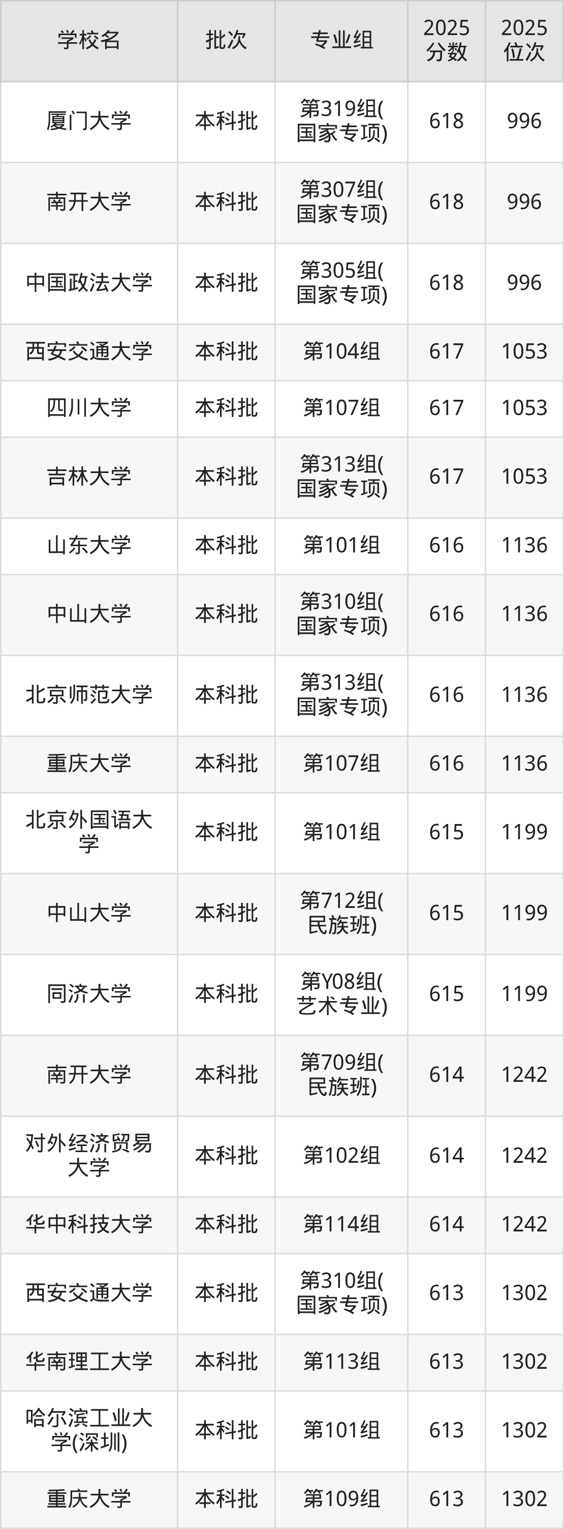2025年湖南高考历史类616分(1054名~1136名)能上的大学有北京师范大学第313组(国家专项)、山东大学第101组、中山大学第310组(国家专项)、重庆大学第107组。