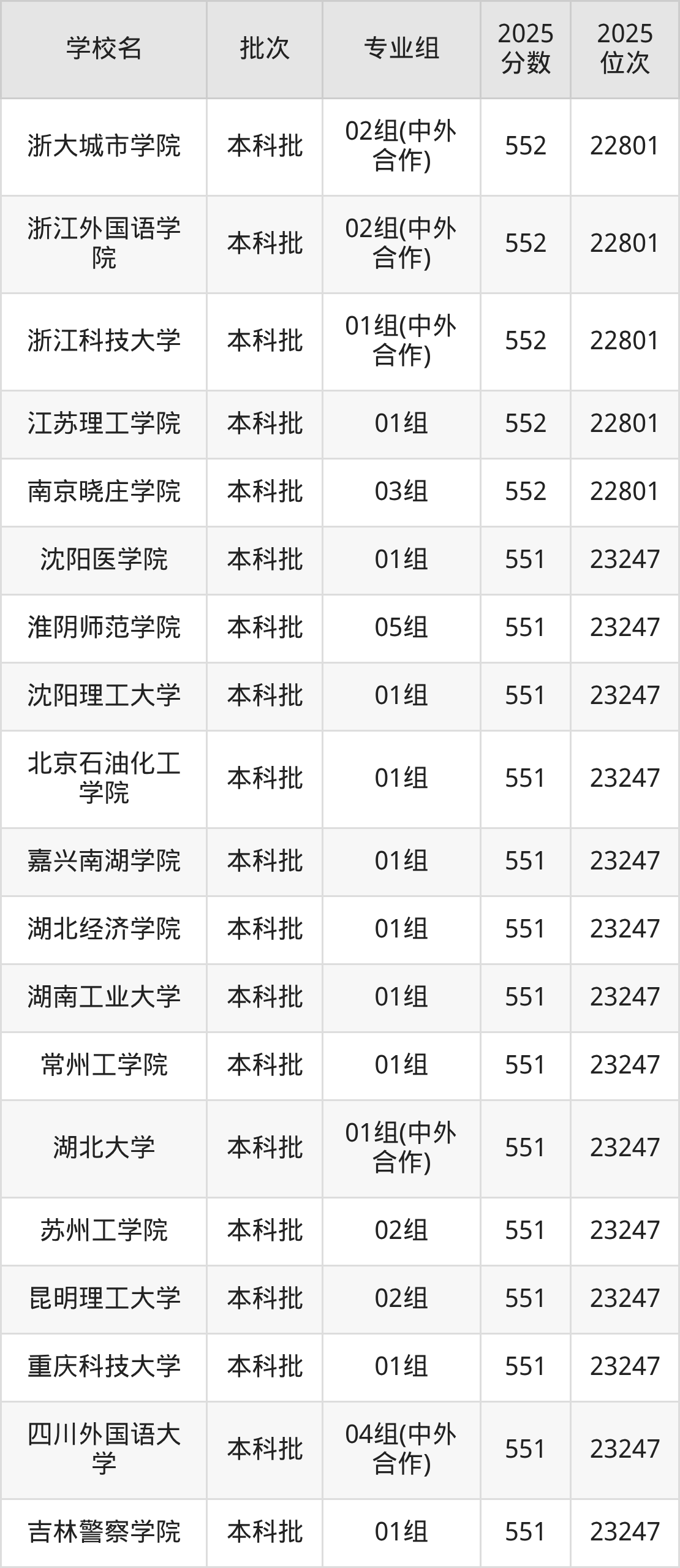 2025年江苏高考历史类552分(22328名~22801名)能上的大学有南京晓庄学院03组、江苏理工学院01组、江苏海洋大学01组、浙江科技大学01组(中外合作)等。