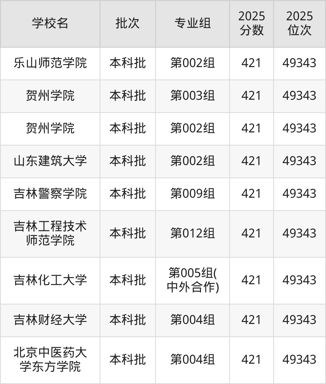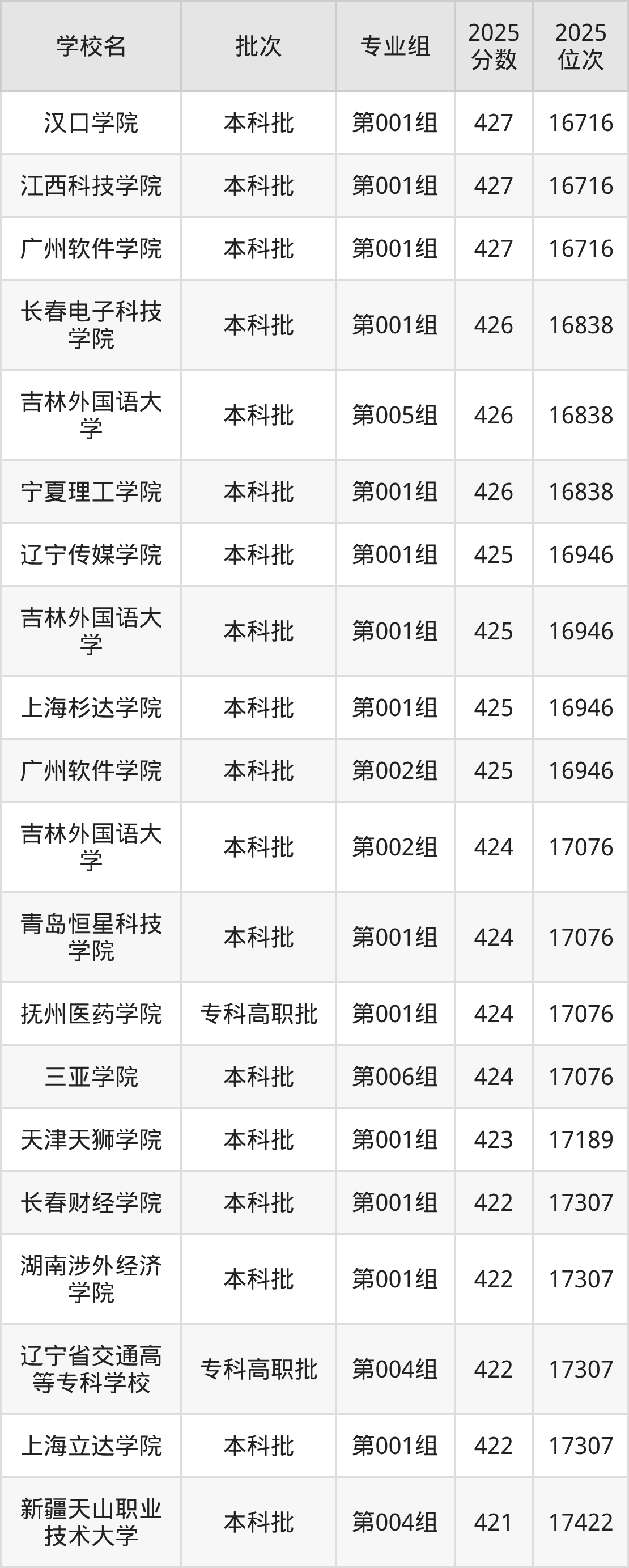 2025年吉林高考历史类422分(17190名~17307名)能上的大学有长春财经学院第001组、上海立达学院第001组、湖南涉外经济学院第001组、辽宁省交通高等专科学校第004组。