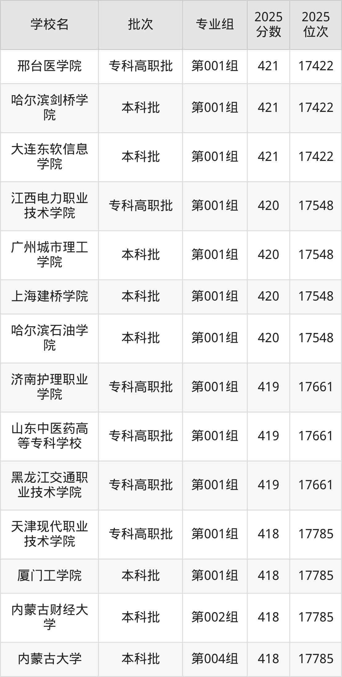 另外录取位次低于该区间(较稳妥)的有新疆天山职业技术大学第004组(17422名)、邢台医学院第001组(17422名)等;录取位次高于该区间(可冲)的有天津天狮学院第001组(17189名)、抚州医药学院第001组(17076名)等。