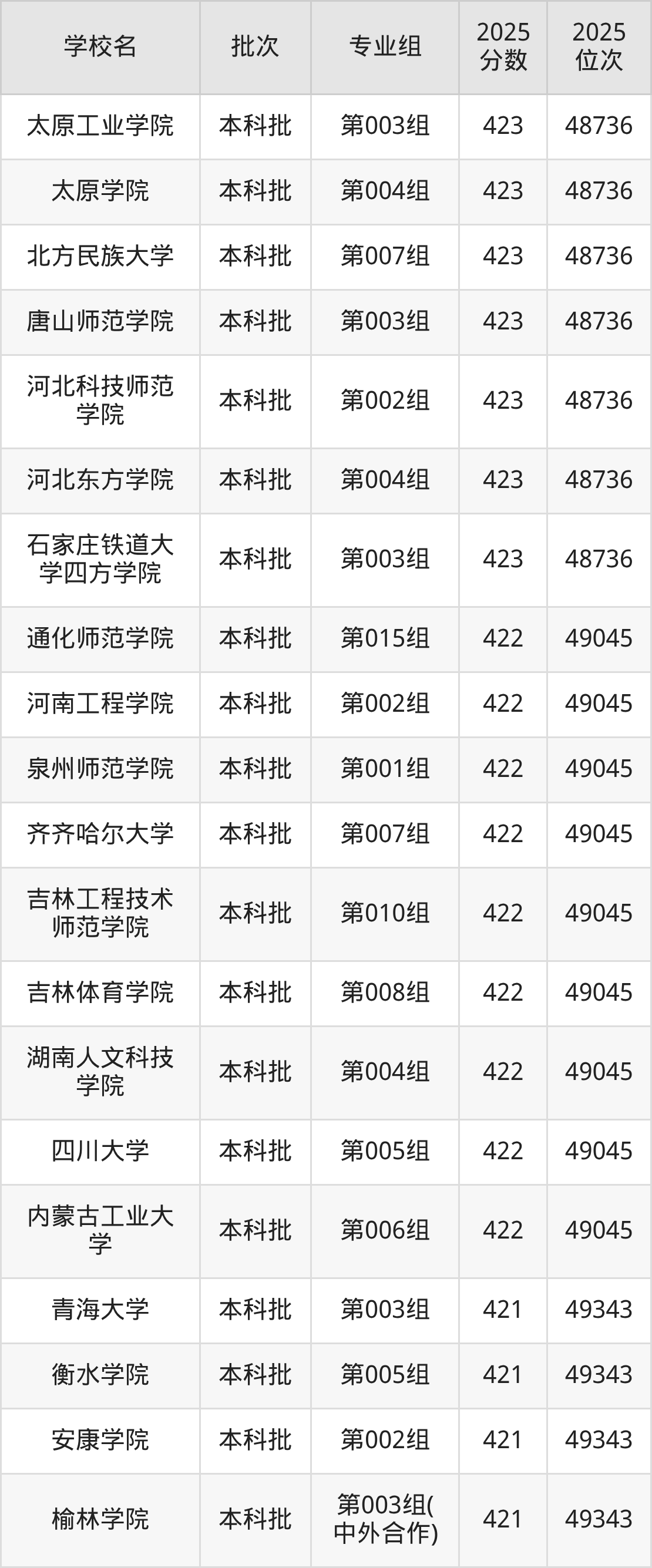 2025年吉林高考物理类422分(48737名~49045名)能上的大学有内蒙古工业大学第006组、通化师范学院第015组、吉林工程技术师范学院第010组、吉林体育学院第008组等。