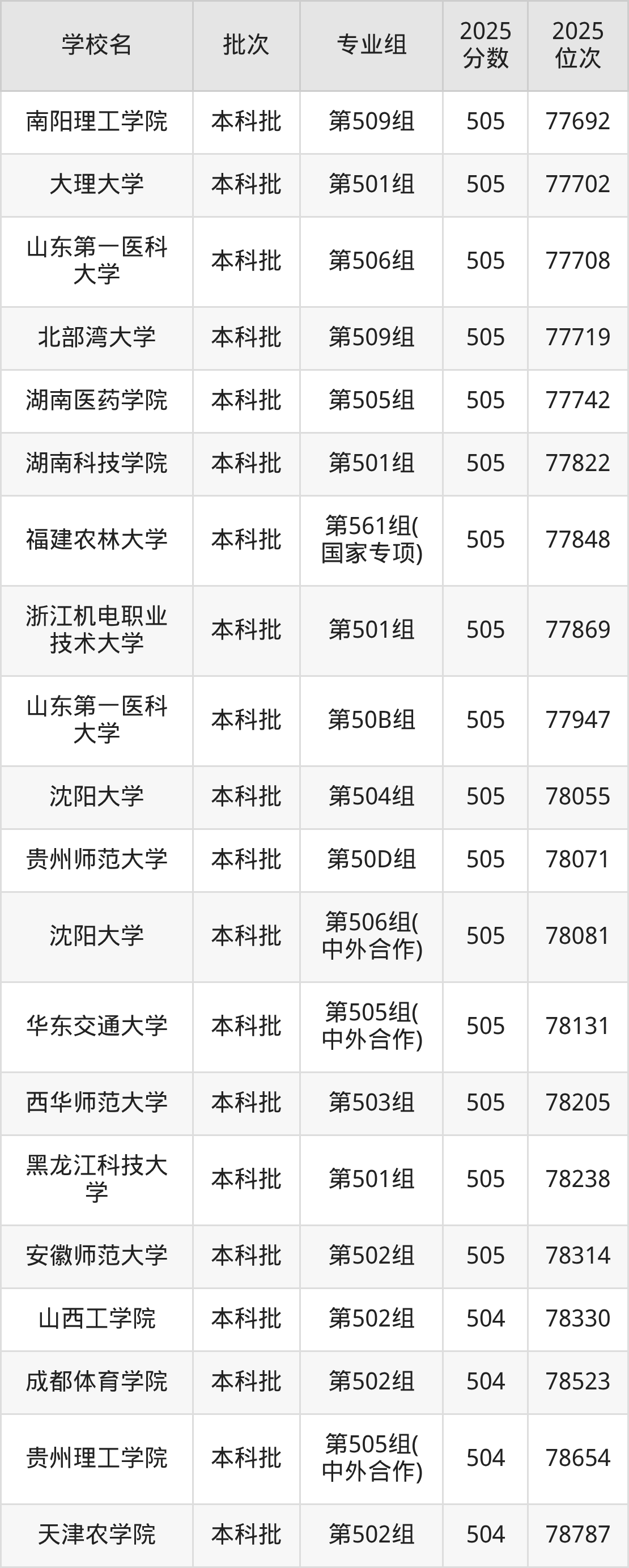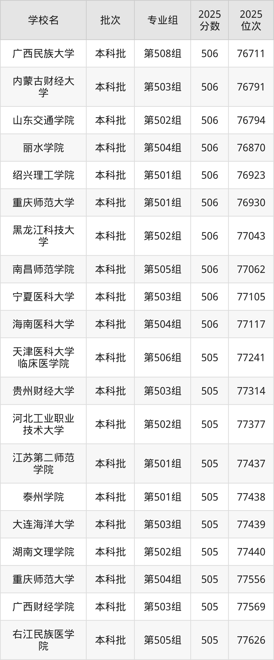 另外录取位次低于该区间(较稳妥)的有山西工学院第502组(78330名)、成都体育学院第502组(78523名)等;录取位次高于该区间(可冲)的有海南医科大学第504组(77117名)、宁夏医科大学第503组(77105名)等。
