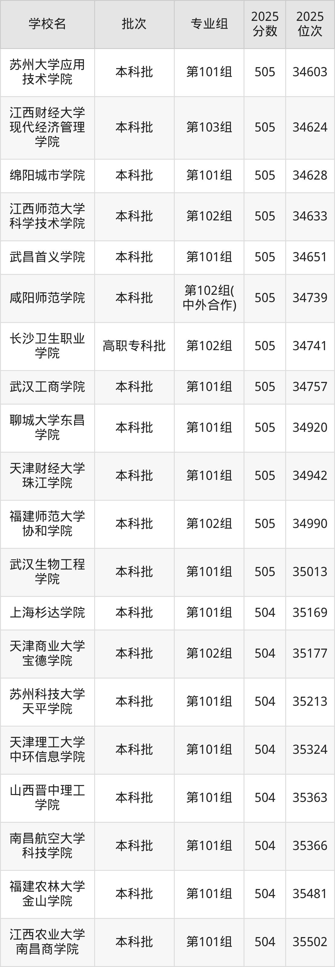 2025年江西高考历史类505分(34370名~35019名)能上的大学有武汉生物工程学院第101组、咸阳师范学院第102组(中外合作)、天津财经大学珠江学院第101组、河北地质大学华信学院第101组等。