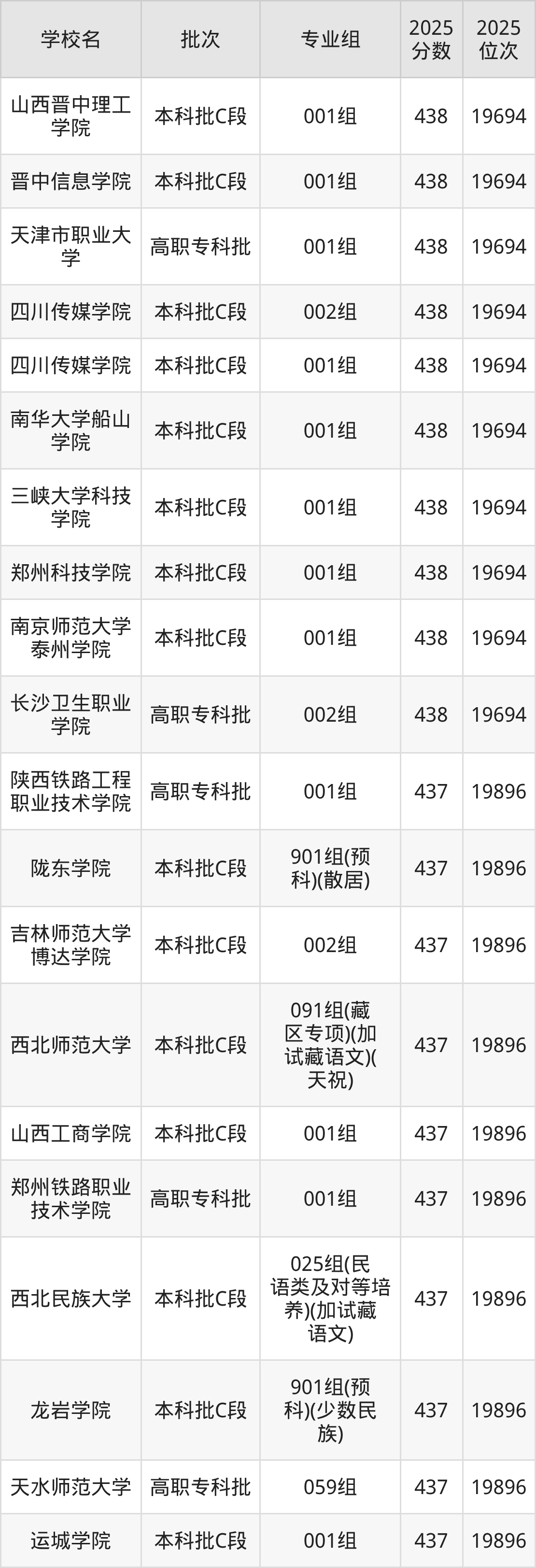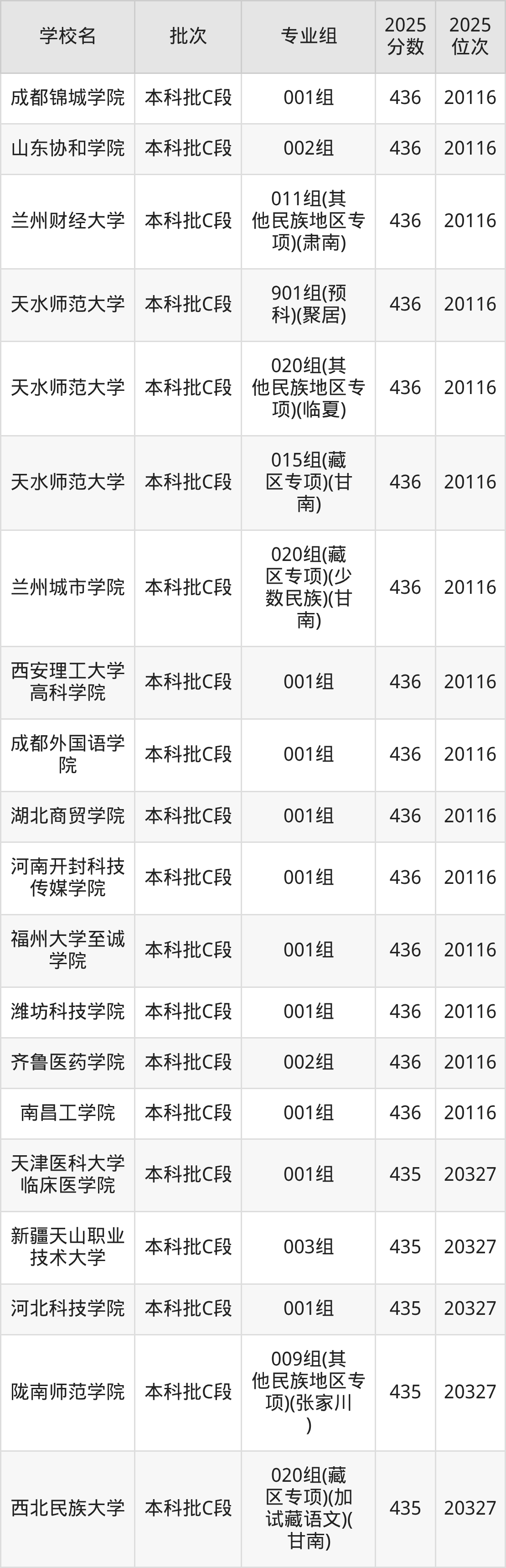 2025年甘肃高考历史类435分(20117名~20327名)能上的大学有天津医科大学临床医学院001组、河北科技学院001组、武汉东湖学院001组、新疆天山职业技术大学003组等。