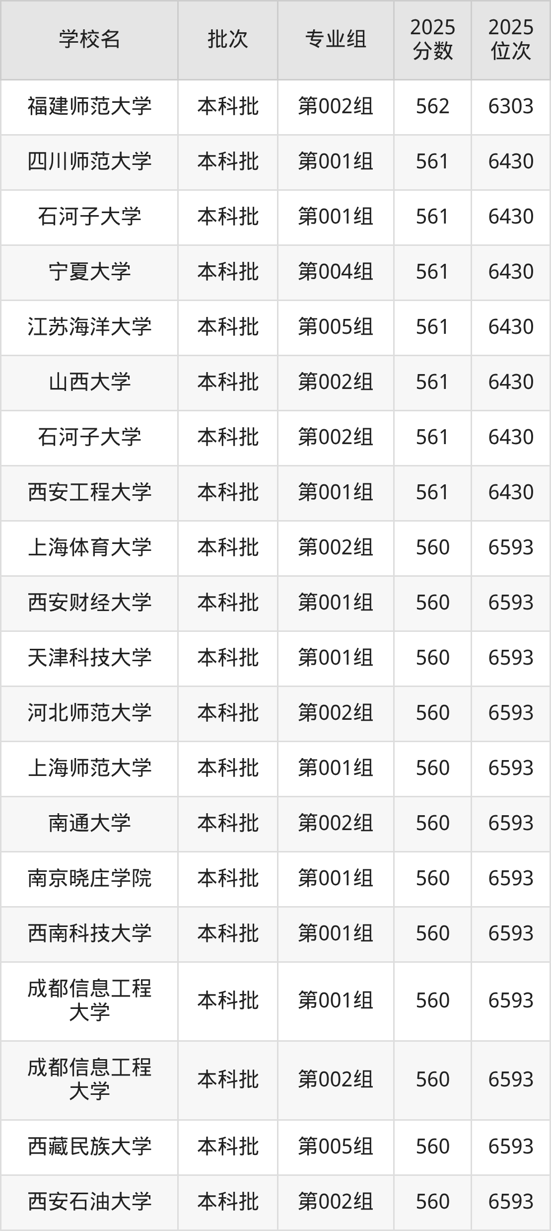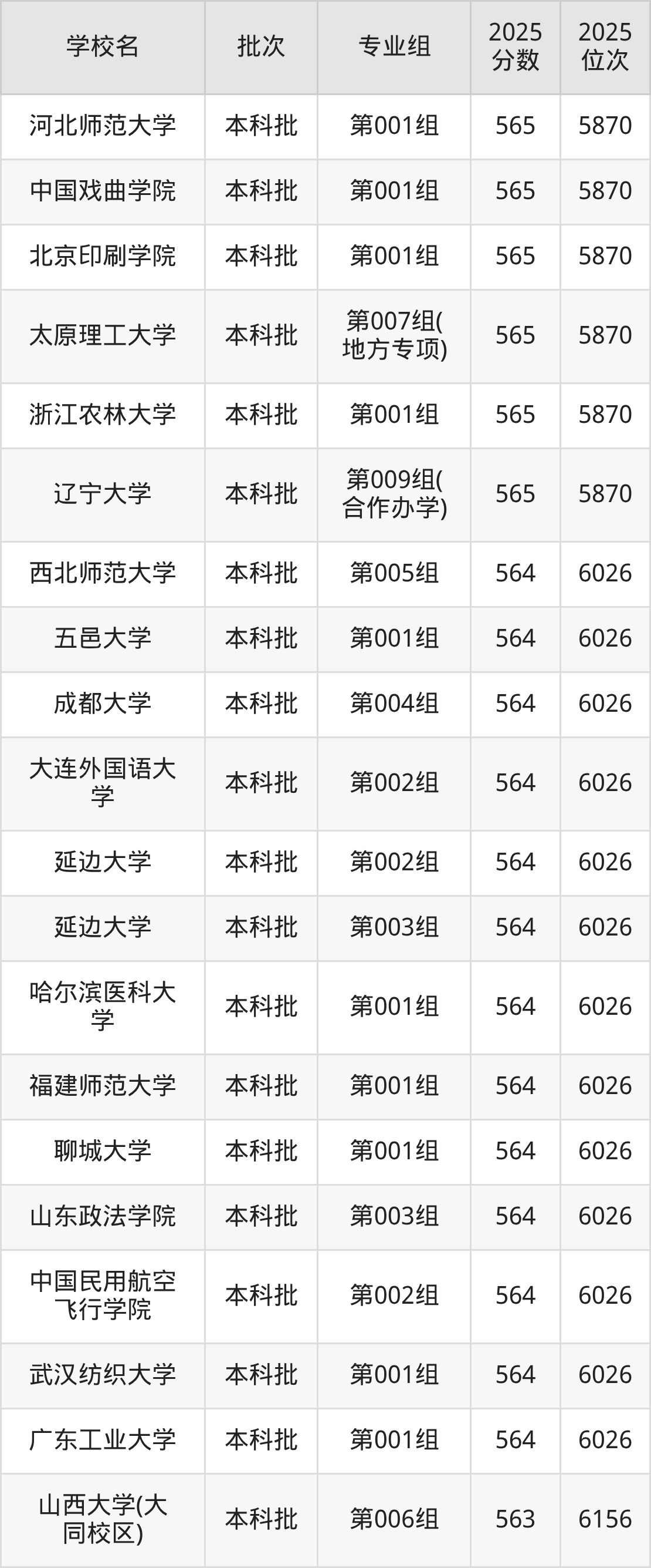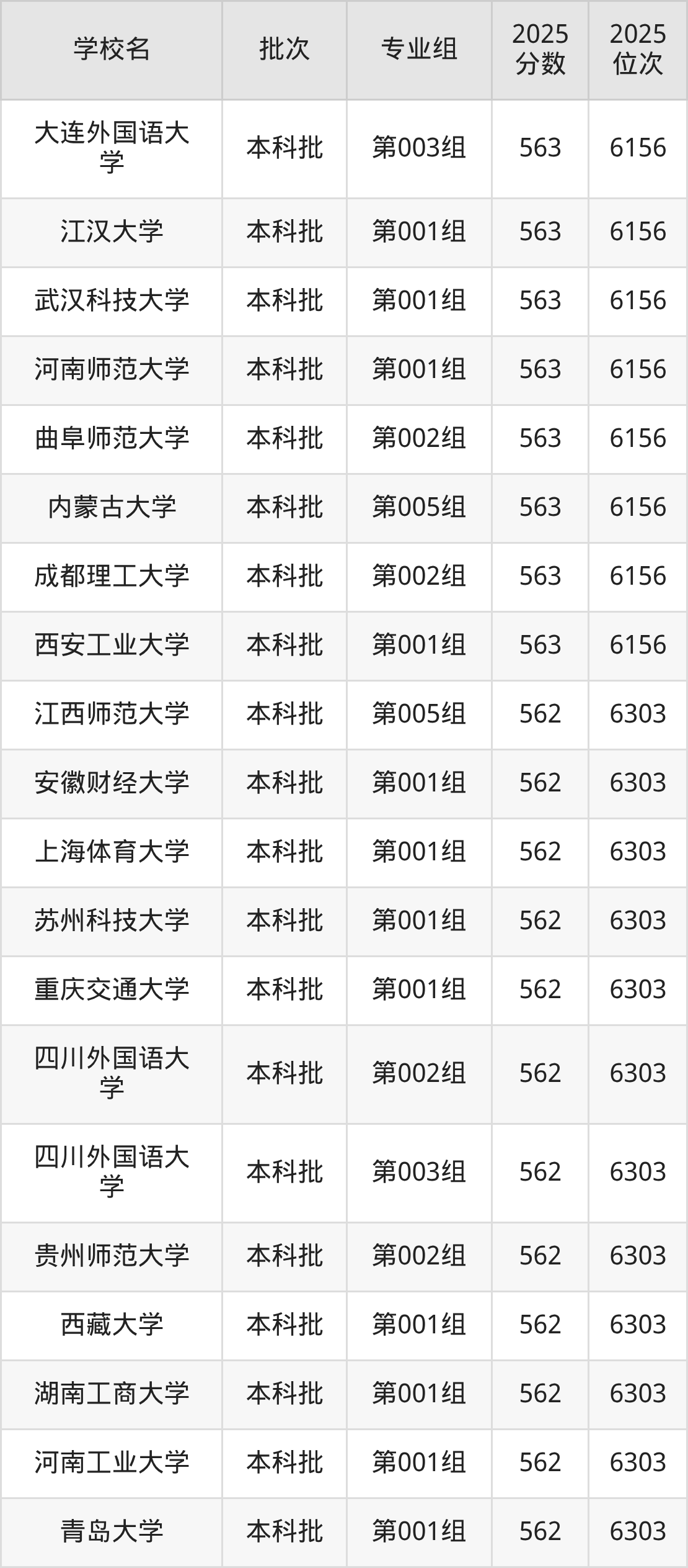 2025年山西高考历史类563分(6027名~6156名)能上的大学有内蒙古大学第005组、大连外国语大学第003组、曲阜师范大学第002组、河南师范大学第001组等。