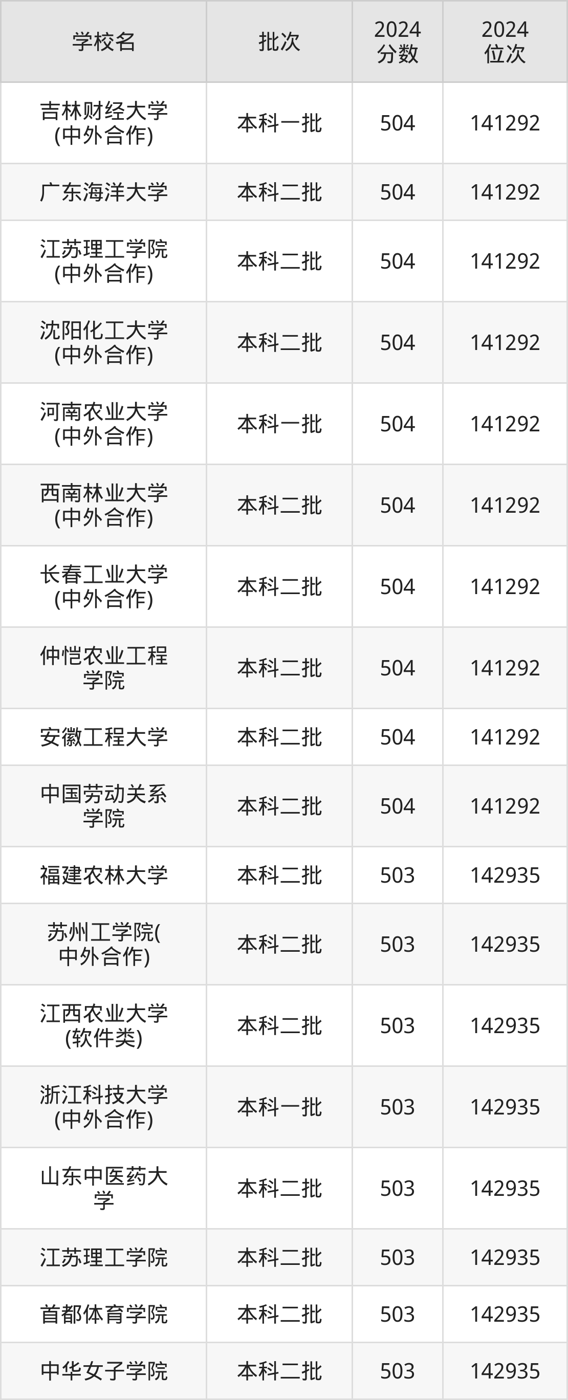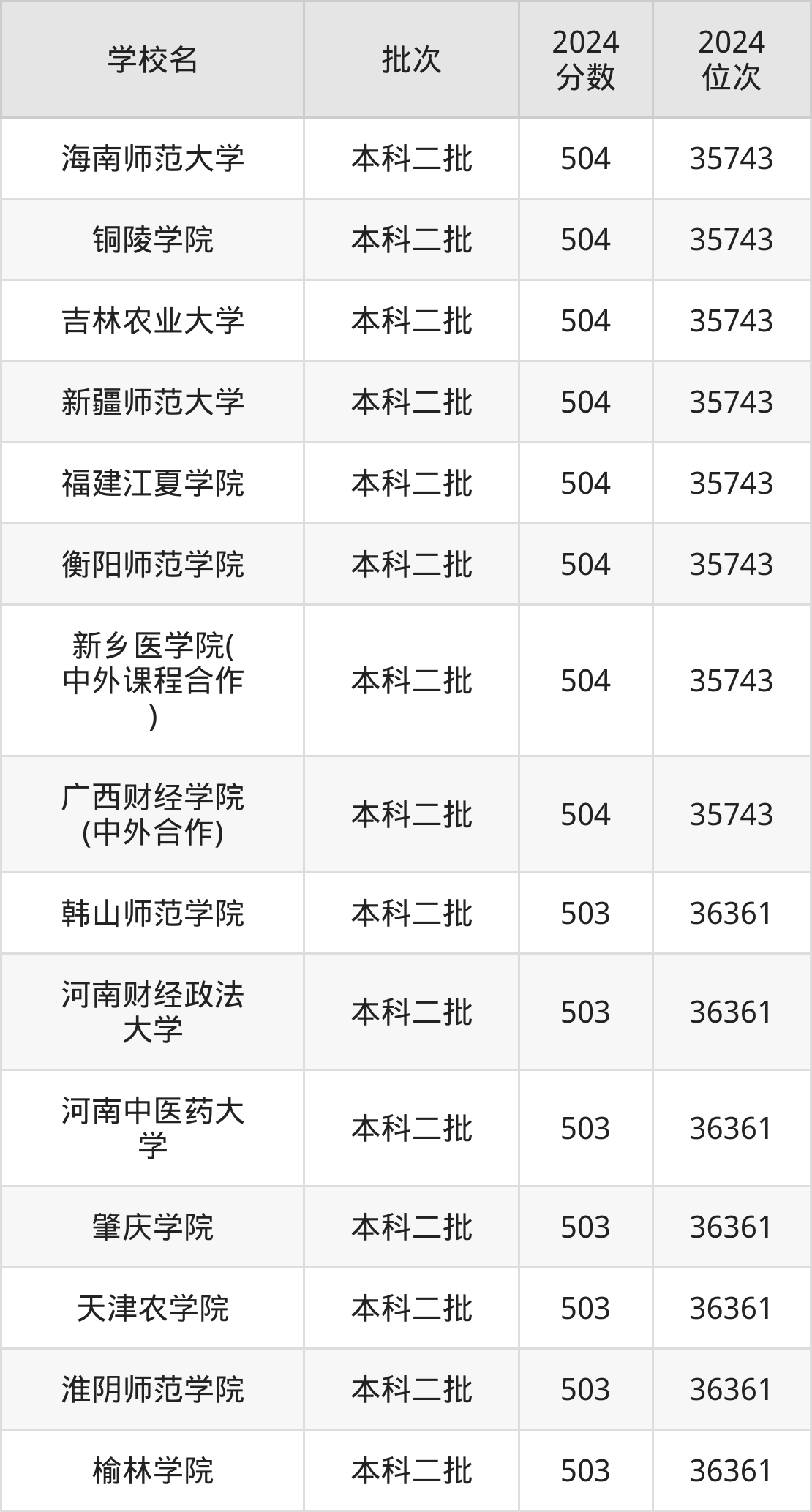 2024年河南高考文科503分(35744名~36361名)能上的大学有河南财经政法大学、河南中医药大学、肇庆学院、天津农学院等。