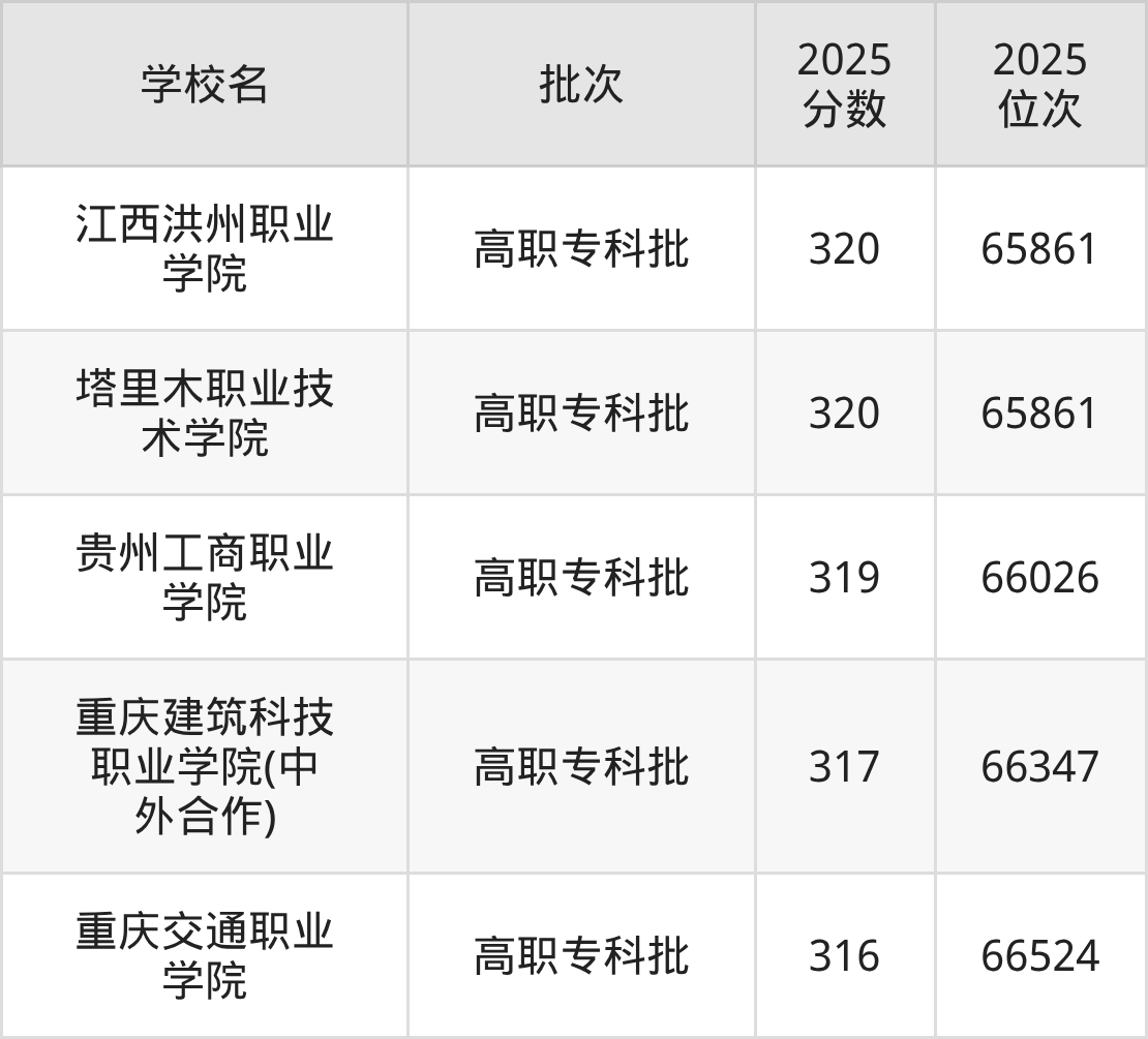 另外录取位次低于该区间(较稳妥)的有重庆交通职业学院(66524名)、江西科技职业学院(66997名)等;录取位次高于该区间(可冲)的有贵州工商职业学院(66026名)、塔里木职业技术学院(65861名)等。