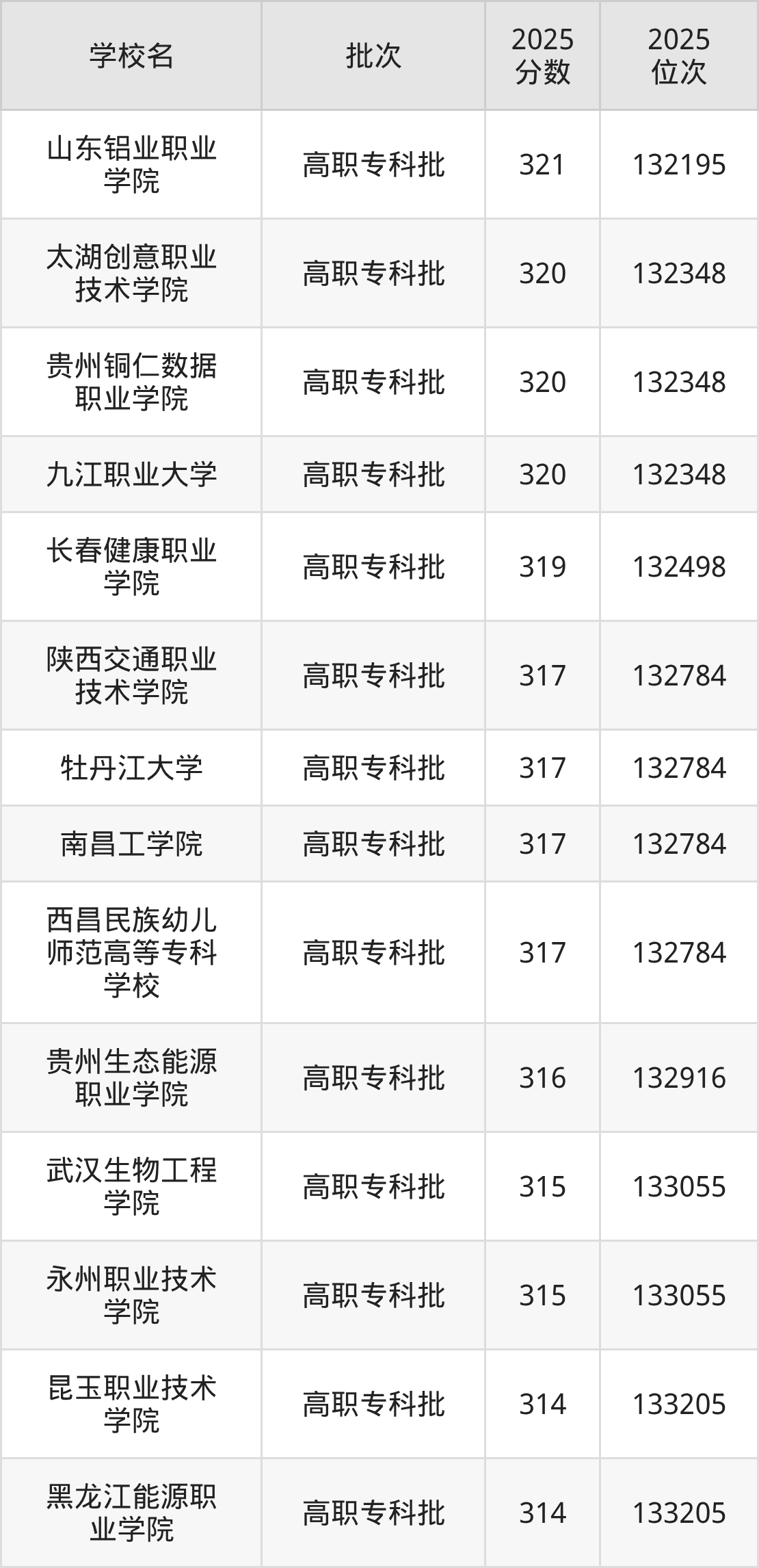 另外录取位次低于该区间(较稳妥)的有贵州生态能源职业学院(132916名)、武汉生物工程学院(133055名)等;录取位次高于该区间(可冲)的有长春健康职业学院(132498名)、贵州铜仁数据职业学院(132348名)等。