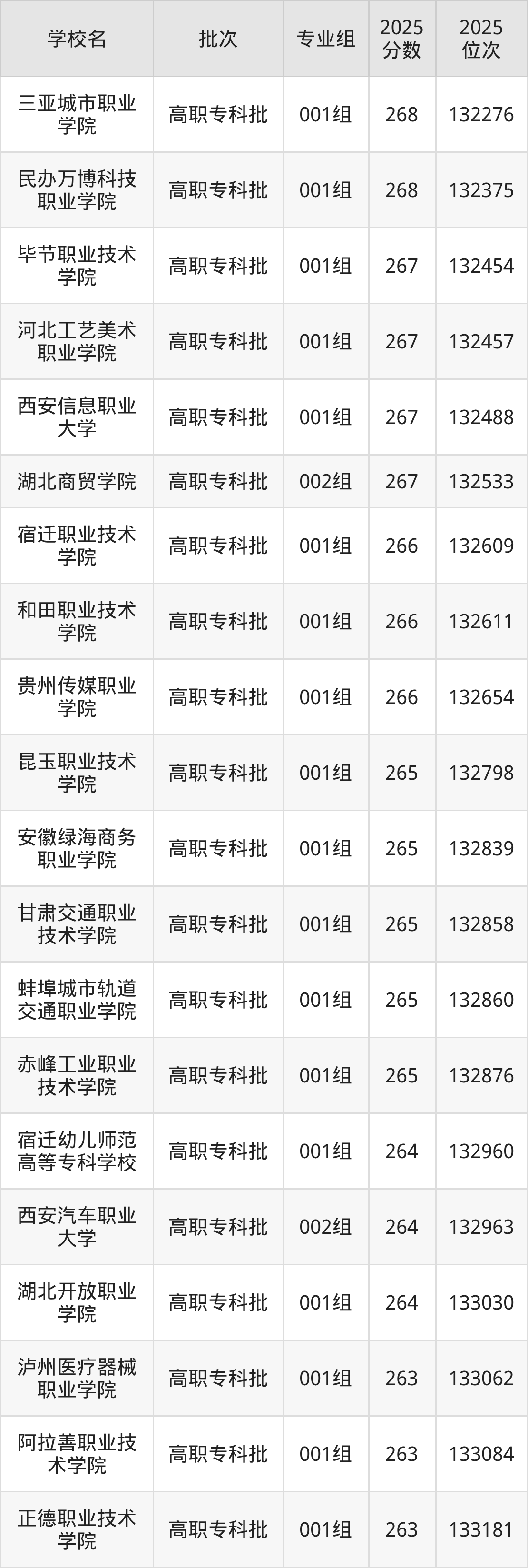 2025年安徽高考历史类265分(132734名~132902名)能上的大学有赤峰工业职业技术学院001组、甘肃交通职业技术学院001组、昆玉职业技术学院001组、安徽绿海商务职业学院001组等。