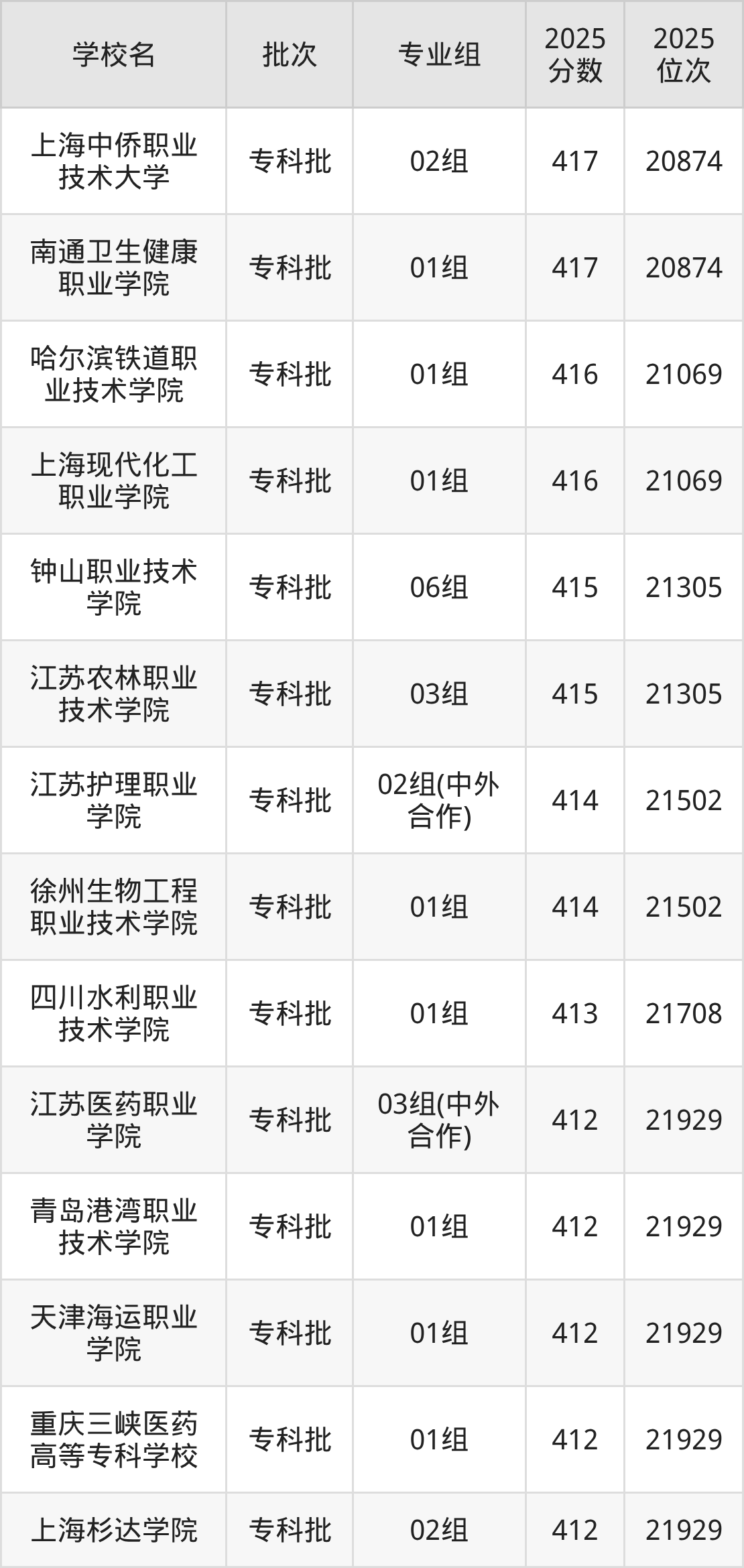 2025年江苏高考历史类414分(21306名~21502名)能上的大学有徐州生物工程职业技术学院01组、江苏护理职业学院02组(中外合作)。