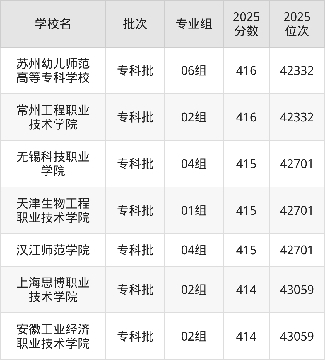 2025年江苏高考物理类414分(42702名~43059名)能上的大学有安徽工业经济职业技术学院02组、上海思博职业技术学院02组。