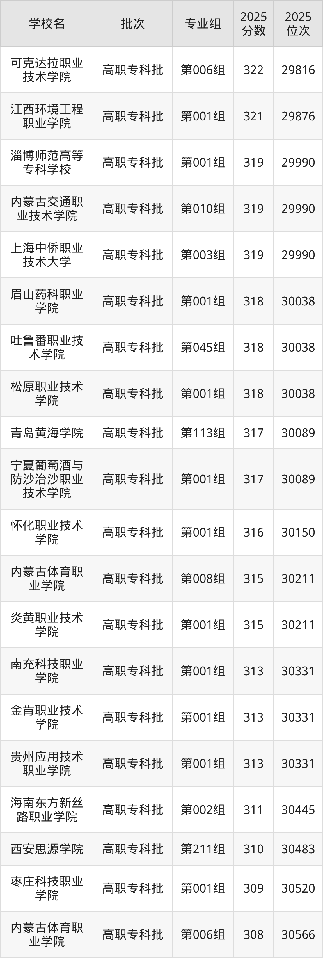 2025年内蒙古高考历史类313分(30275名~30331名)能上的大学有金肯职业技术学院第001组、贵州应用技术职业学院第001组、南充科技职业学院第001组。