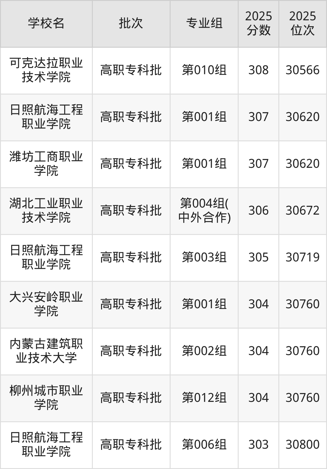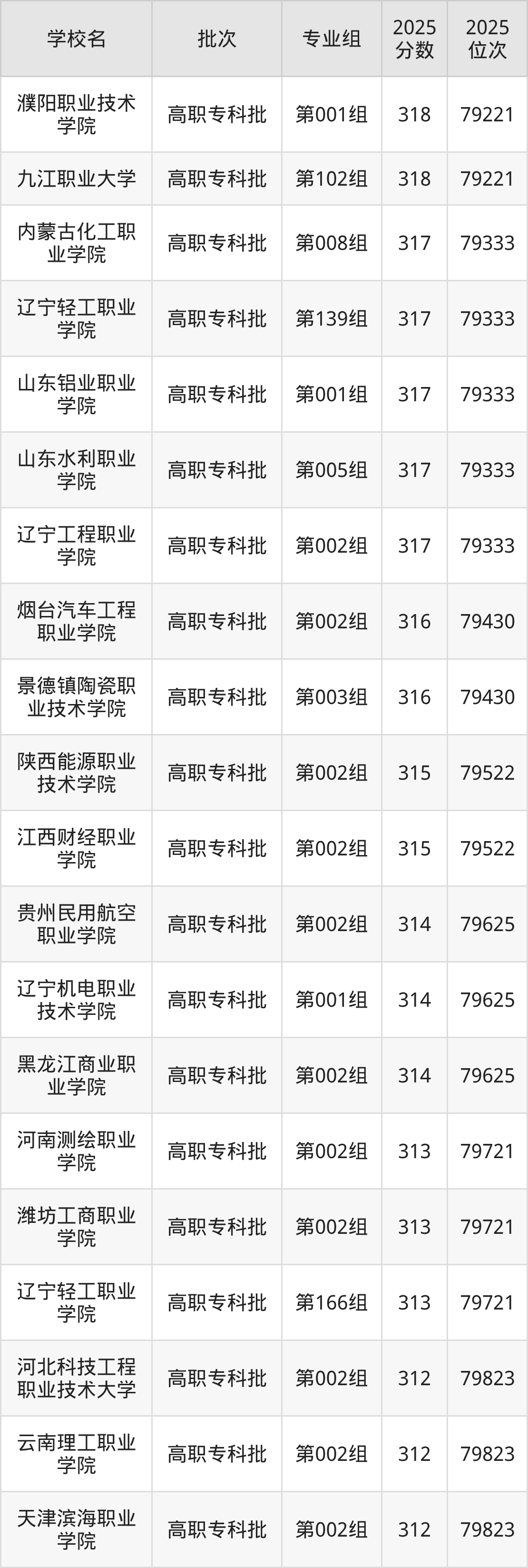 2025年内蒙古高考物理类313分(79626名~79721名)能上的大学有辽宁轻工职业学院第166组、潍坊工商职业学院第002组、河南测绘职业学院第002组。