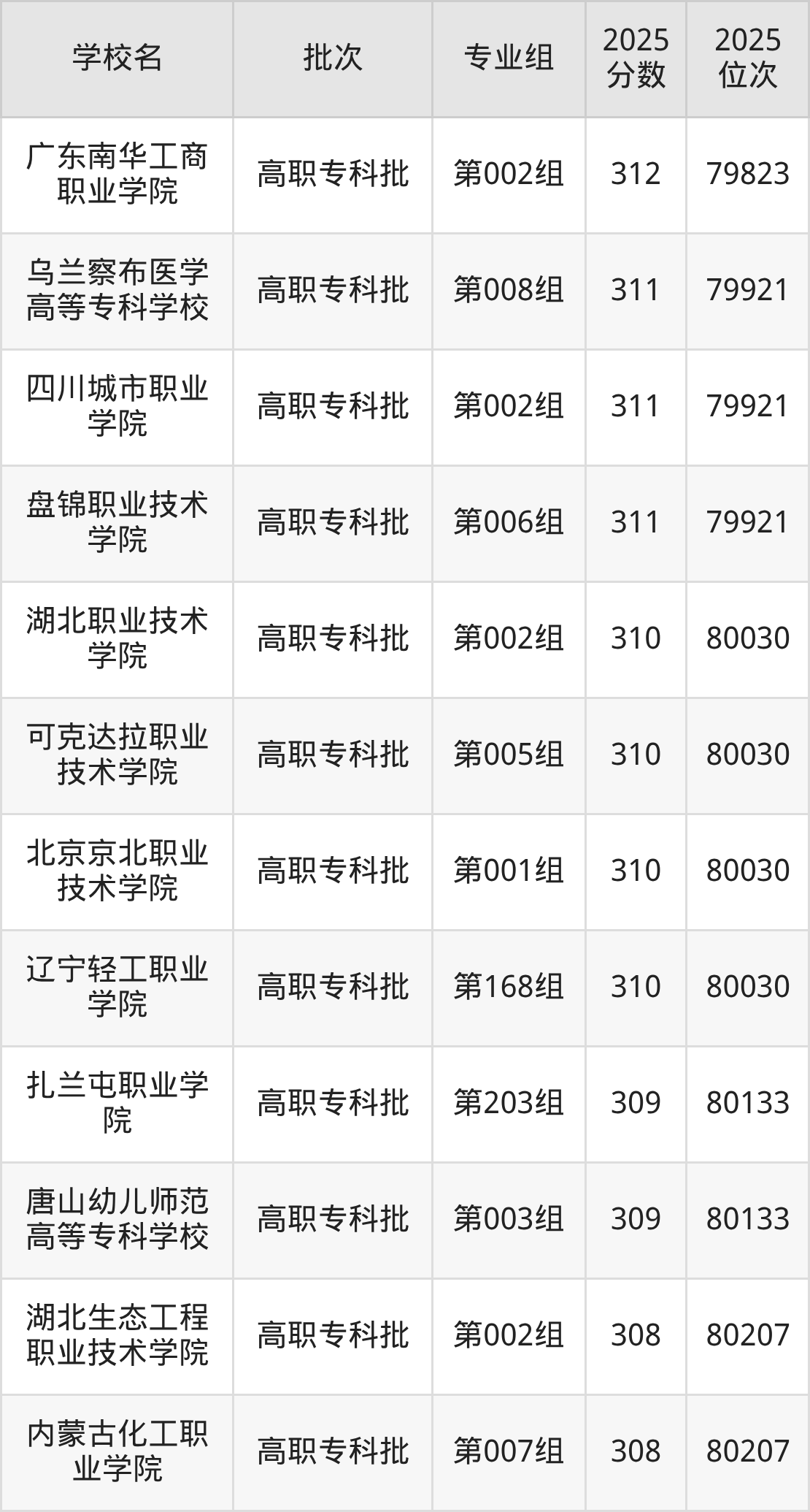 另外录取位次低于该区间(较稳妥)的有广东南华工商职业学院第002组(79823名)、天津滨海职业学院第002组(79823名)等;录取位次高于该区间(可冲)的有黑龙江商业职业学院第002组(79625名)、辽宁机电职业技术学院第001组(79625名)等。