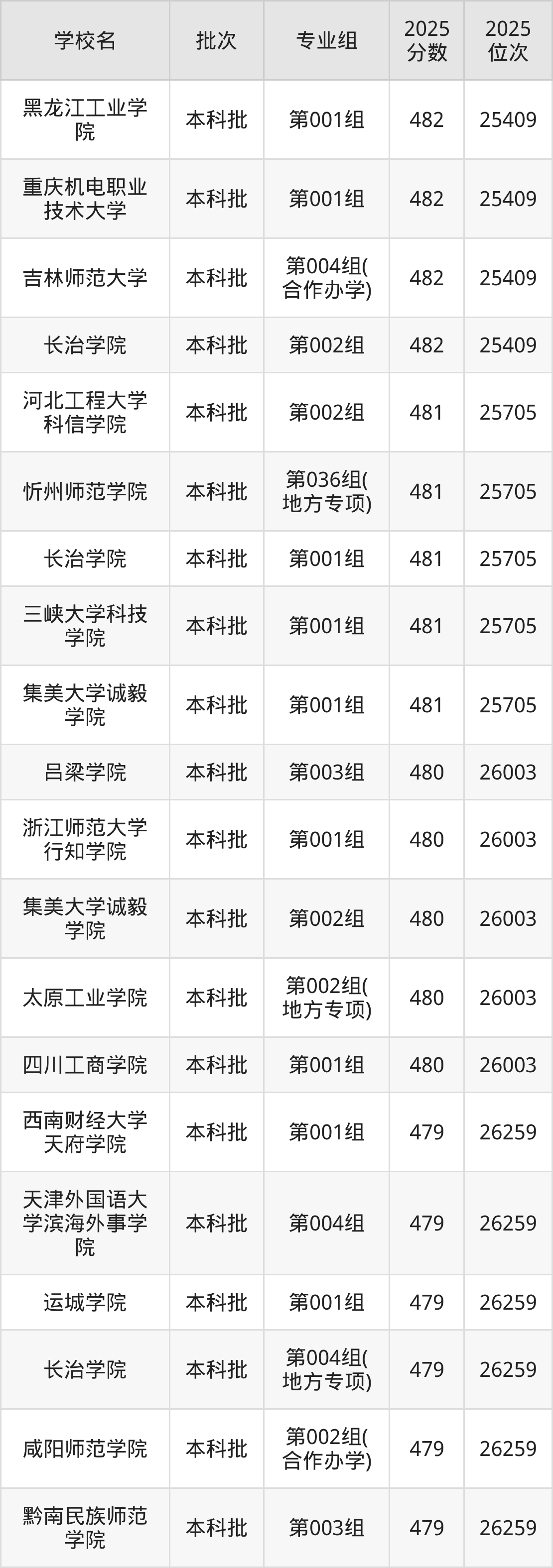 2025年山西高考历史类480分(25706名~26003名)能上的大学有浙江师范大学行知学院第001组、集美大学诚毅学院第002组、四川工商学院第001组、吕梁学院第003组等。