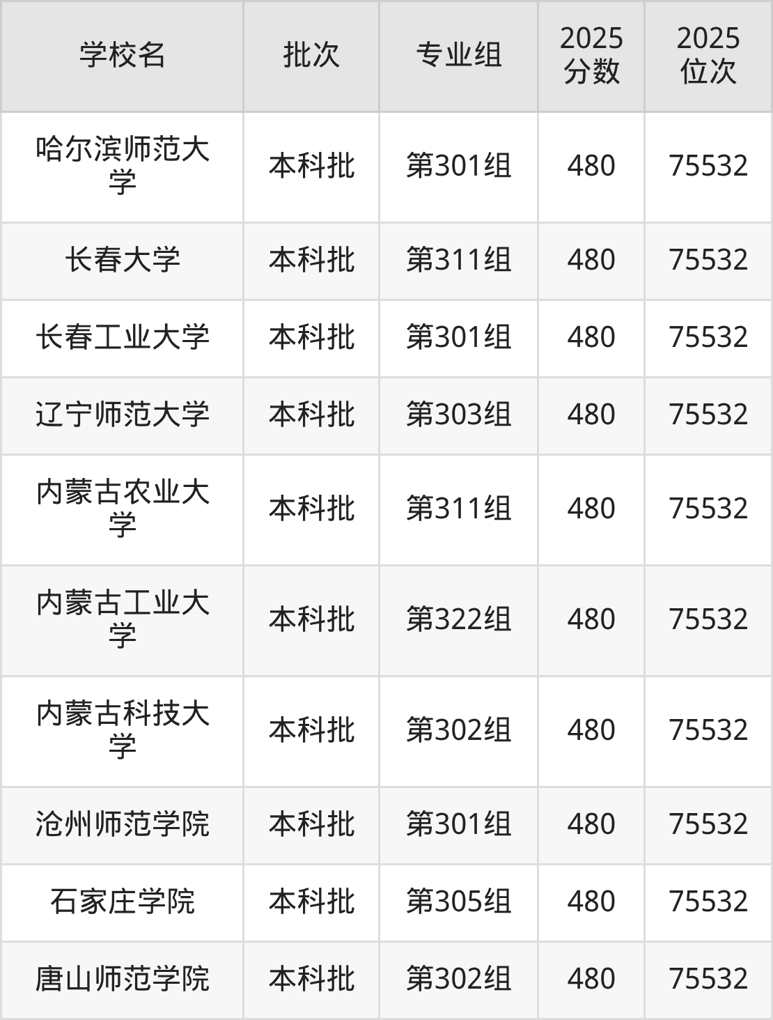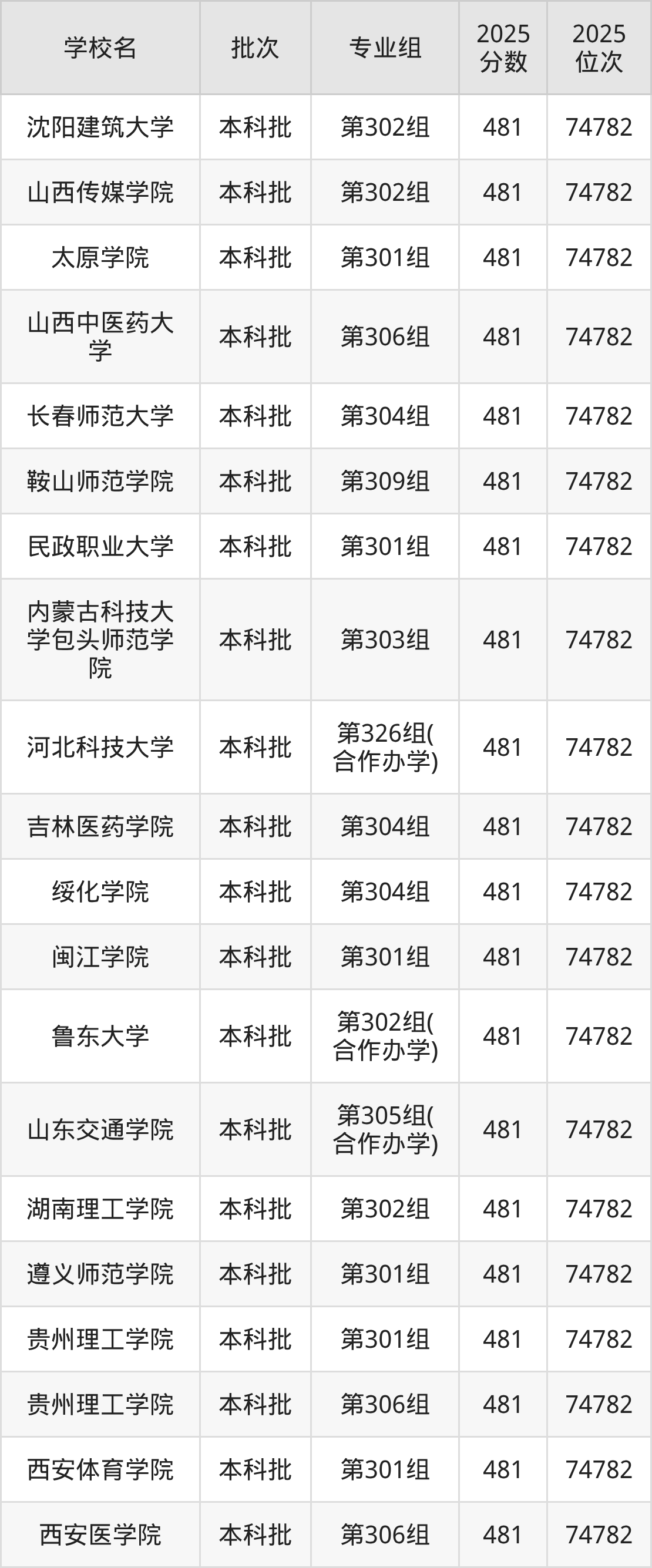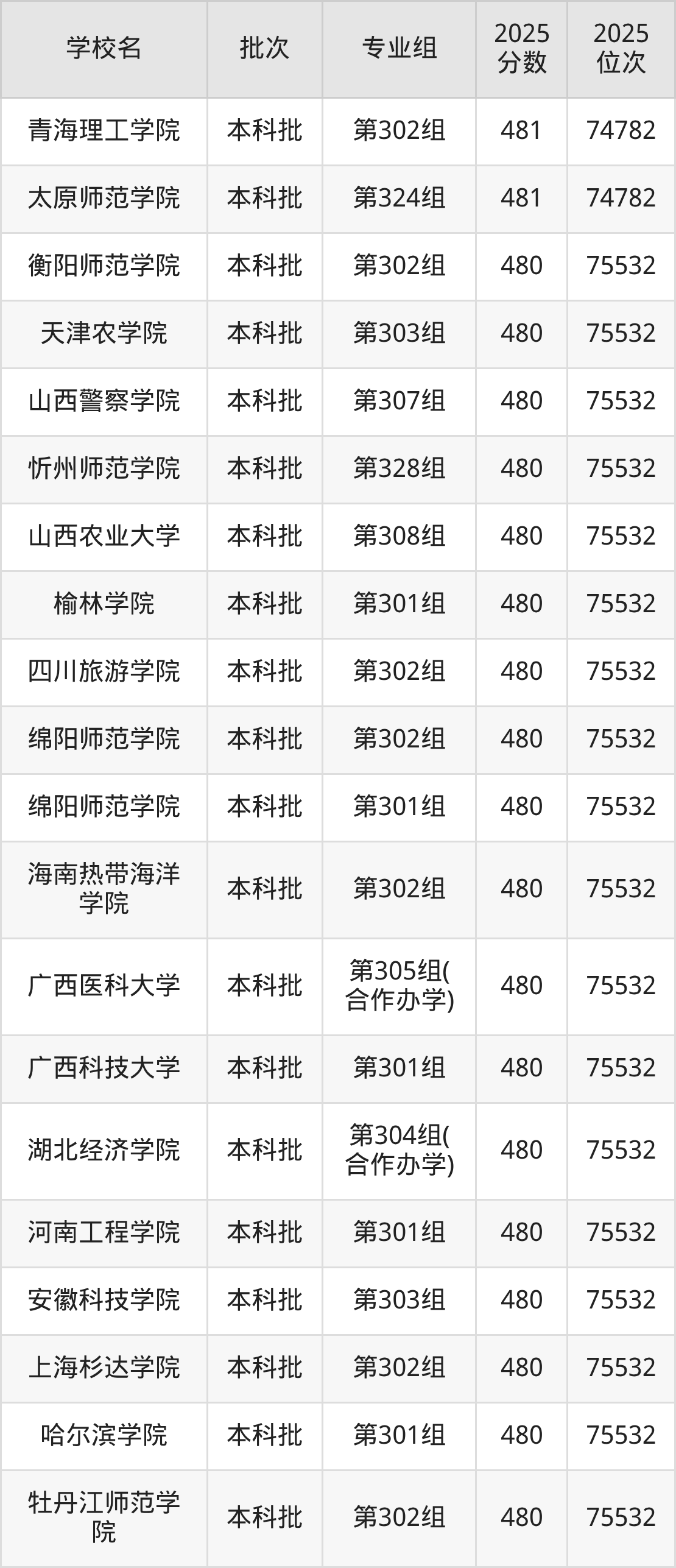 2025年山西高考物理类480分(74783名~75532名)能上的大学有天津农学院第303组、唐山师范学院第302组、石家庄学院第305组、沧州师范学院第301组等。