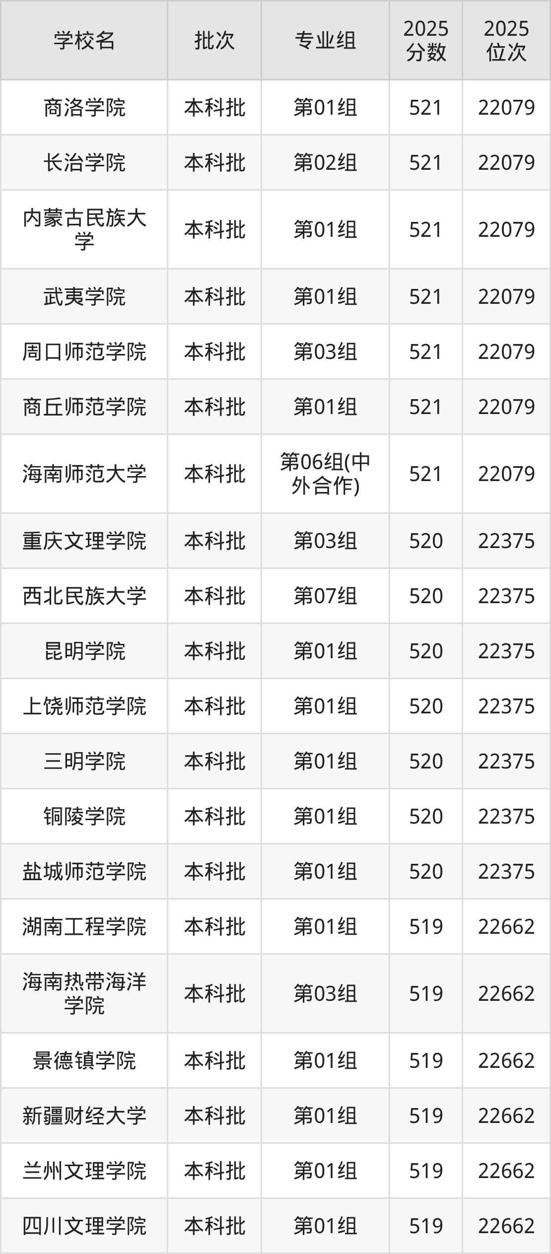 这些都是2026年高考历史类22376名~22662名考生可以报考的大学,更多学校名单如下表所示: