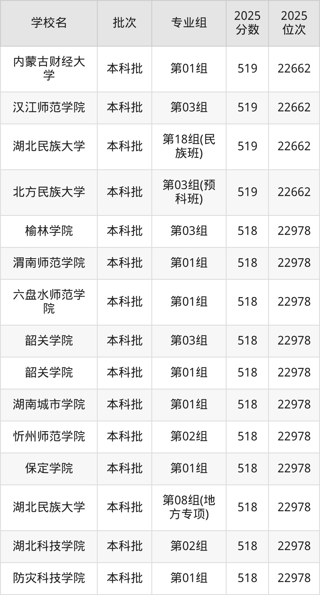 2025年湖北高考历史类519分(22376名~22662名)能上的大学有北方民族大学第03组(预科班)、湖北民族大学第18组(民族班)、汉江师范学院第03组、内蒙古财经大学第01组等。