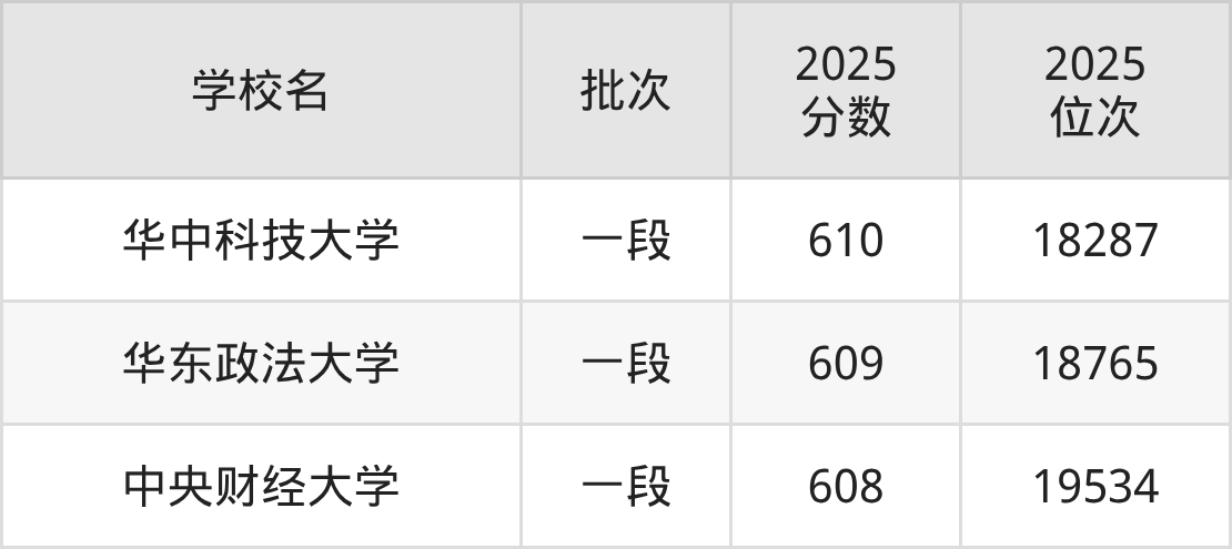 另外录取位次低于该区间(较稳妥)的有中央财经大学(19534名)、重庆大学(19771名)等;录取位次高于该区间(可冲)的有华中科技大学(18287名)、上海外国语大学(17909名)等。