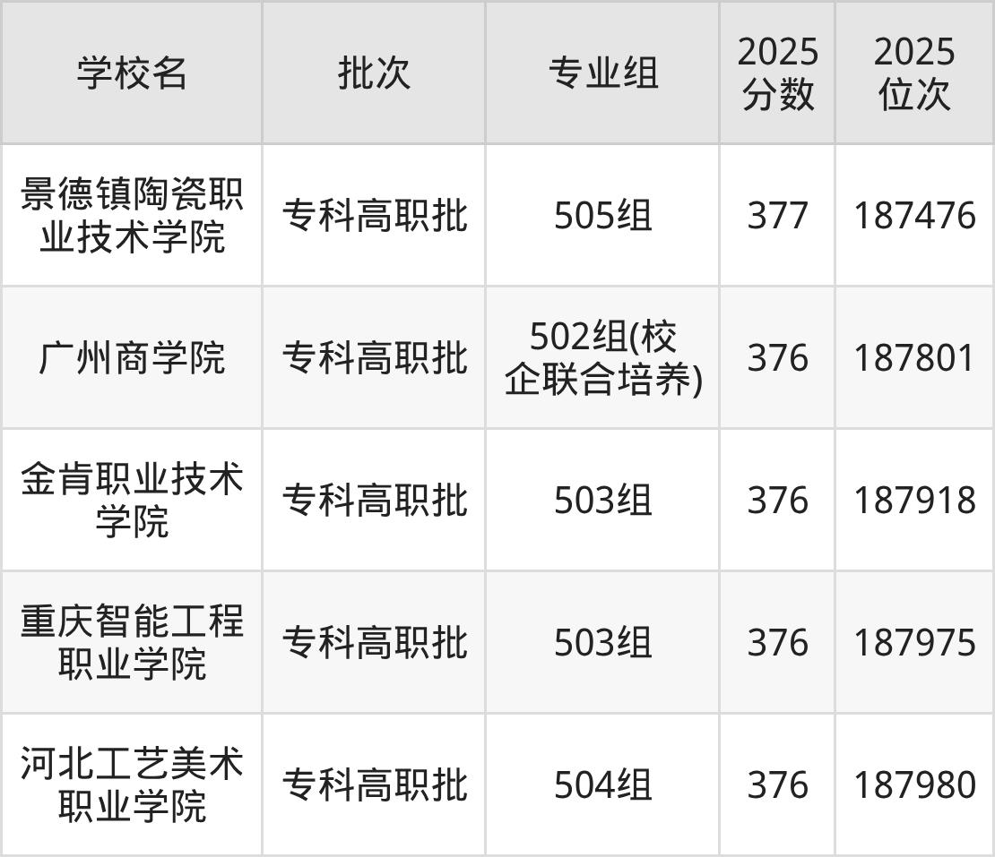2025年广东高考历史类376分(187753名~188837名)能上的大学有金肯职业技术学院503组、广州商学院502组(校企联合培养)、河北工艺美术职业学院504组、重庆智能工程职业学院503组。