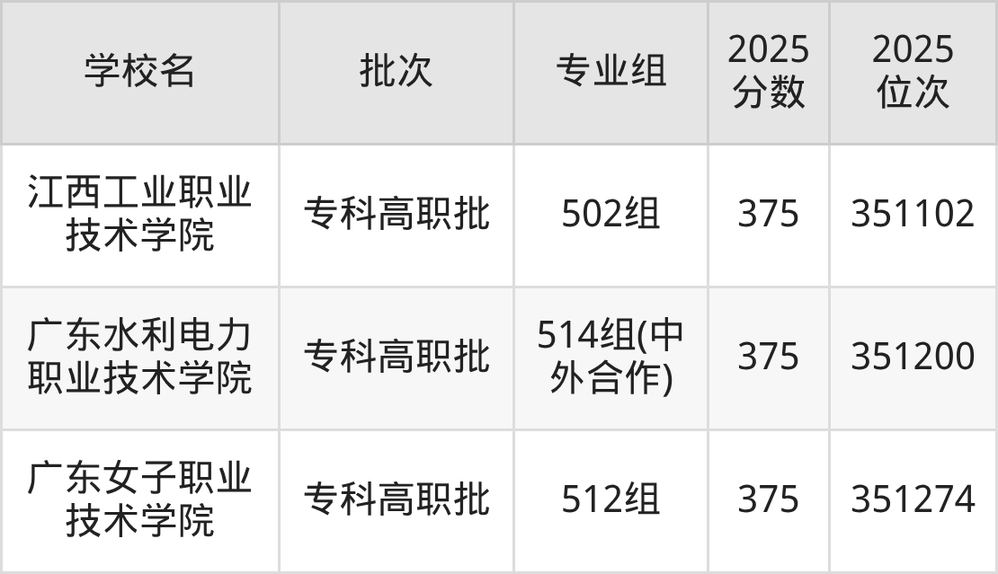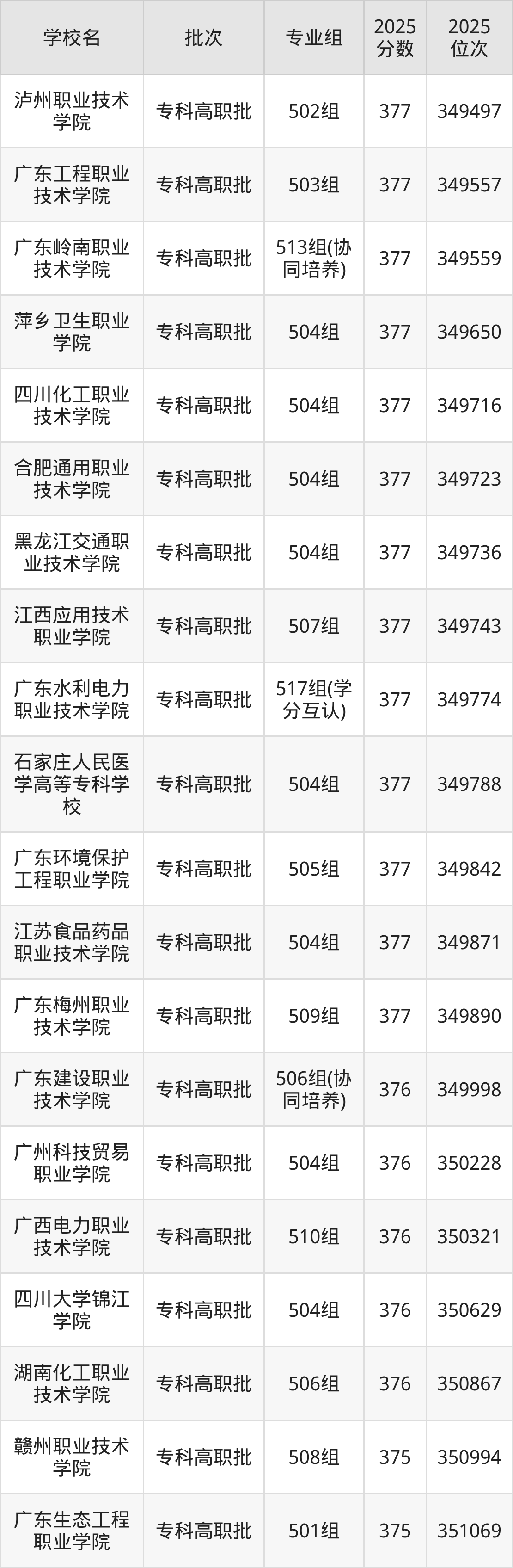2025年广东高考物理类376分(349934名~350981名)能上的大学有广东建设职业技术学院506组(协同培养)、湖南化工职业技术学院506组、广西电力职业技术学院510组、四川大学锦江学院504组等。
