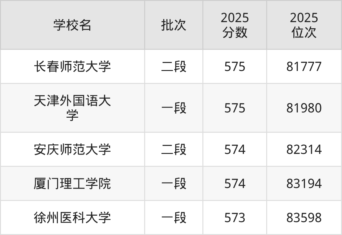 这些都是2026年高考82193名~83385名考生可以报考的大学,更多学校名单如下表所示: