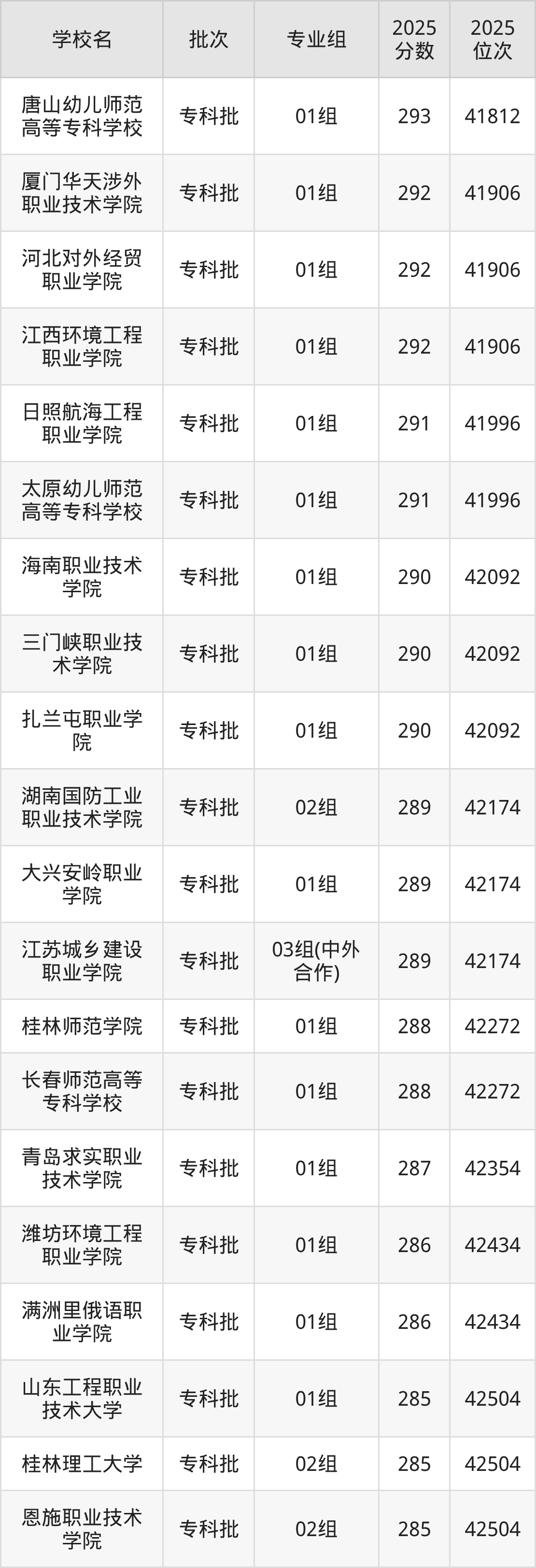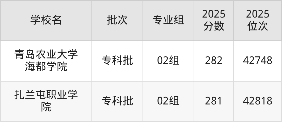 另外录取位次低于该区间(较稳妥)的有潍坊环境工程职业学院01组(42434名)、满洲里俄语职业学院01组(42434名)等;录取位次高于该区间(可冲)的有桂林师范学院01组(42272名)、长春师范高等专科学校01组(42272名)等。