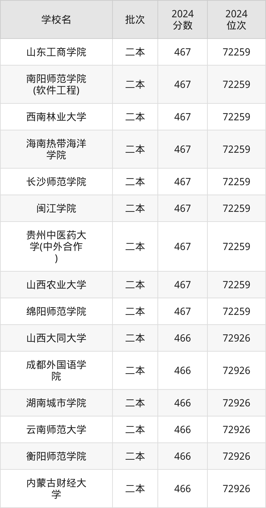 2024年云南高考理科466分(72260名~72926名)能上的大学有衡阳师范学院、湖南城市学院、内蒙古财经大学、成都外国语学院等。