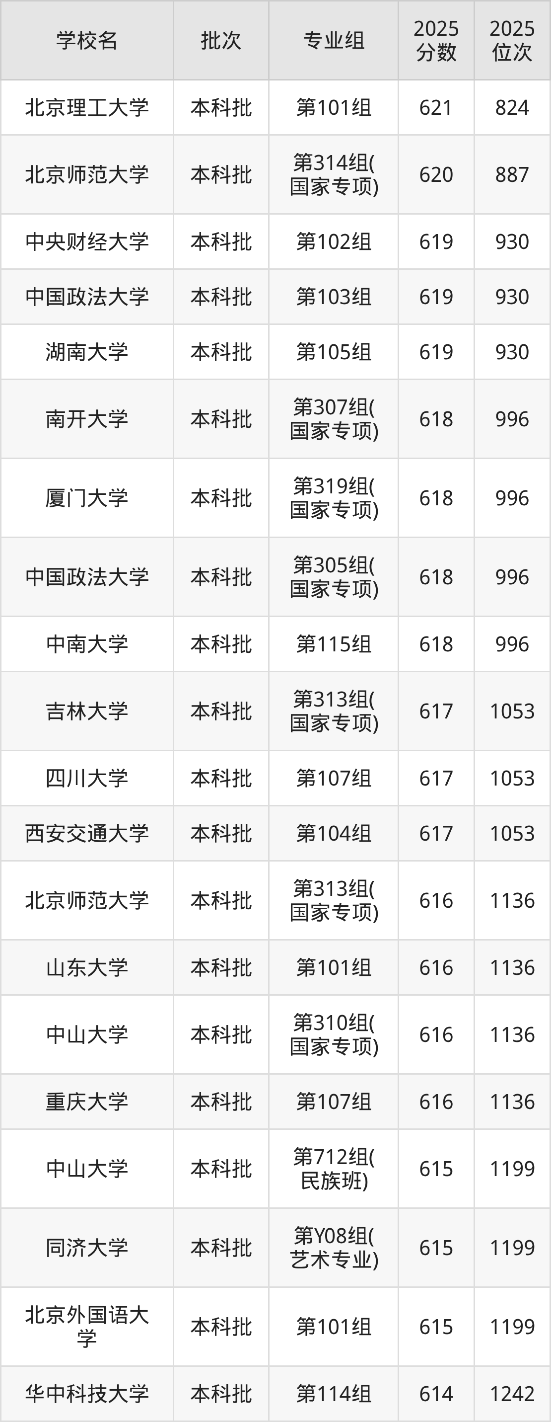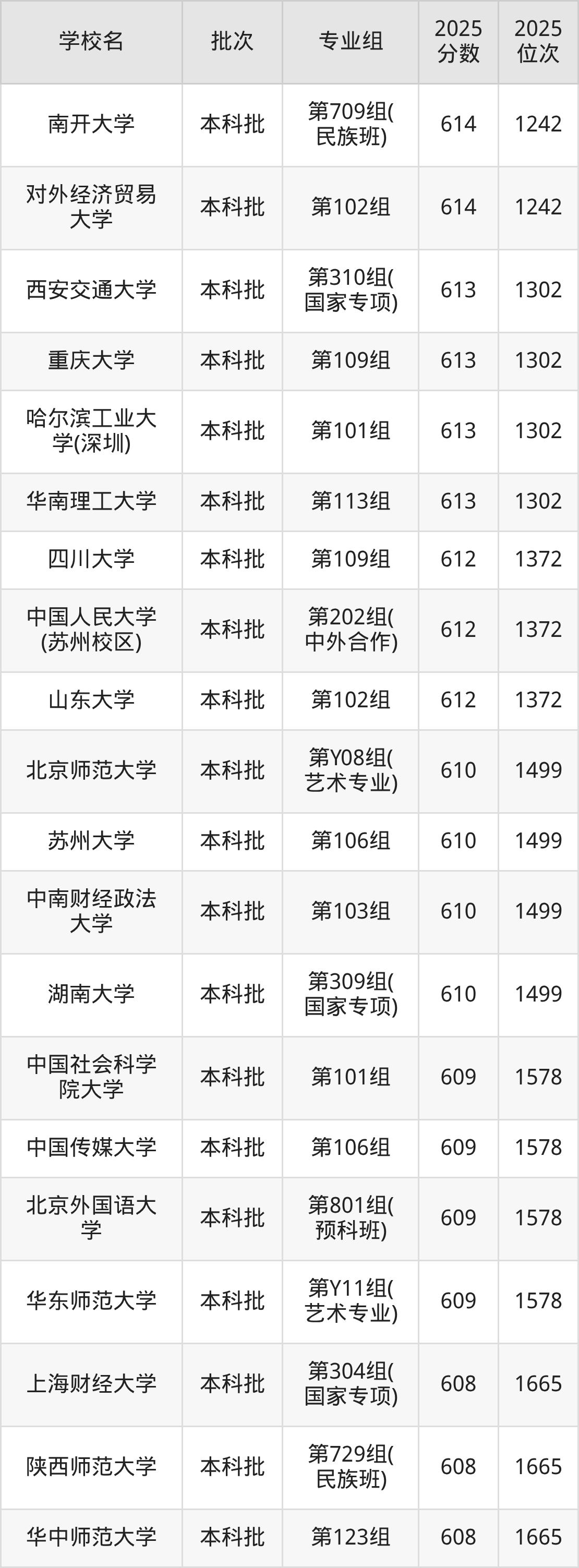 2025年湖南高考历史类612分(1303名~1372名)能上的大学有山东大学第102组、中国人民大学(苏州校区)第202组(中外合作)、四川大学第109组。