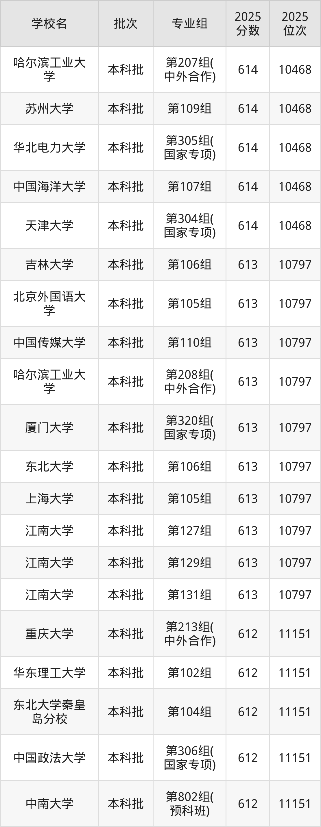 2025年湖南高考物理类612分(10798名~11151名)能上的大学有中国政法大学第306组(国家专项)、东北大学秦皇岛分校第104组、华东理工大学第102组、中国矿业大学第106组等。