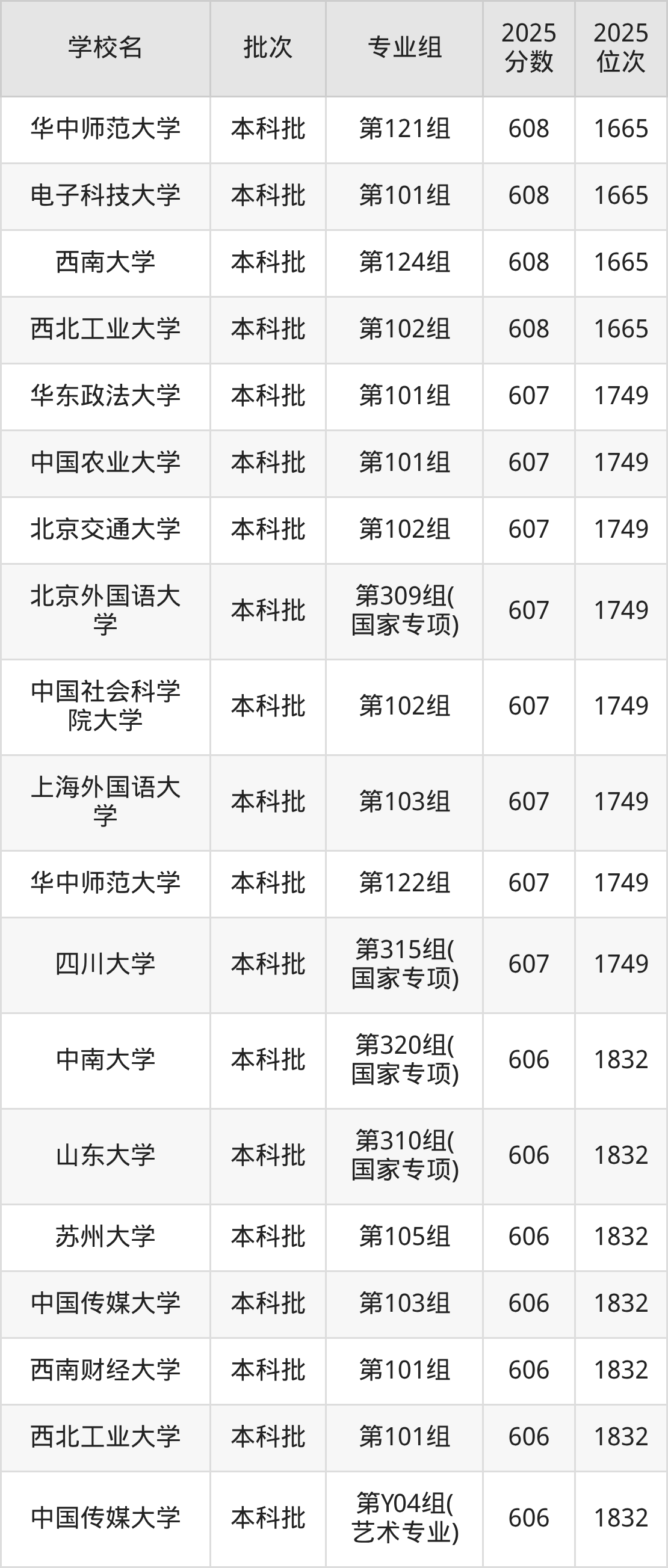 另外录取位次低于该区间(较稳妥)的有东北大学第801组(预科班)(11512名)、华中师范大学第125组(11512名)等;录取位次高于该区间(可冲)的有北京外国语大学第105组(10797名)、中国传媒大学第110组(10797名)等。
