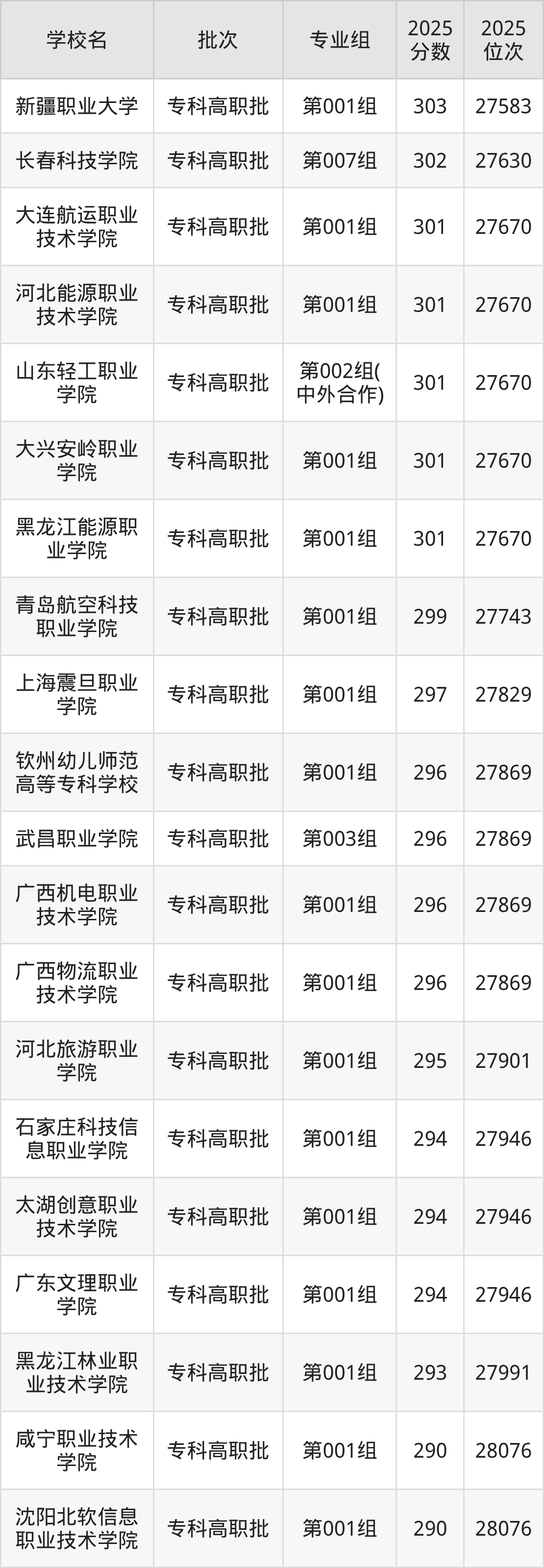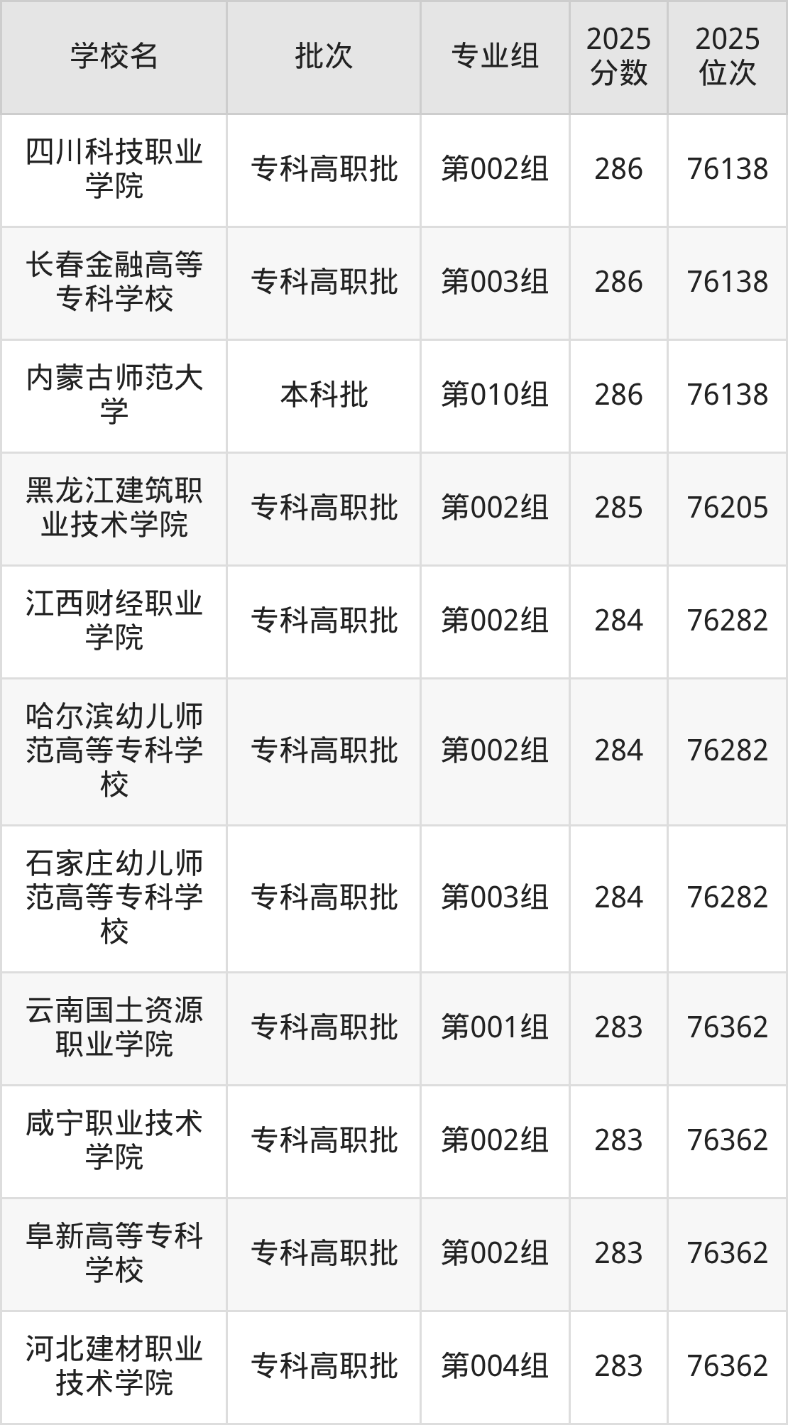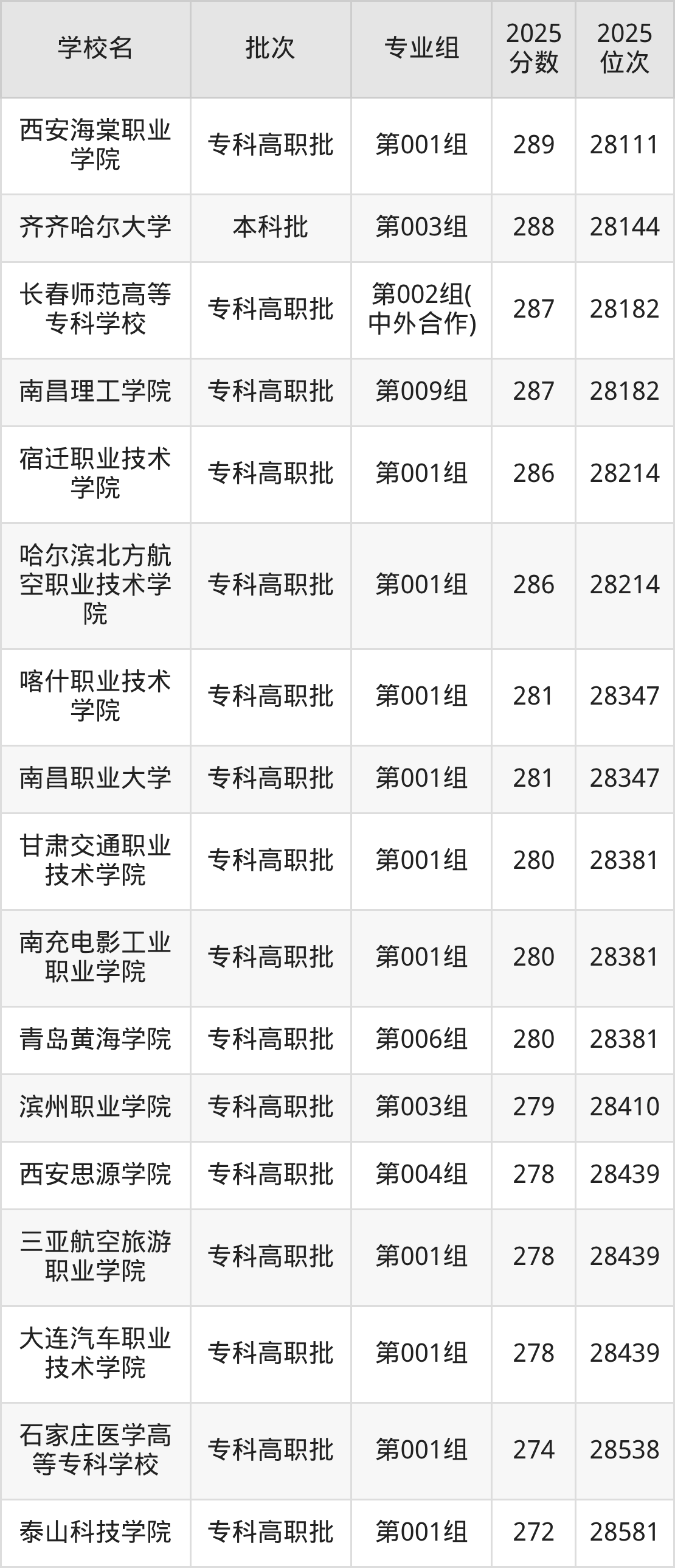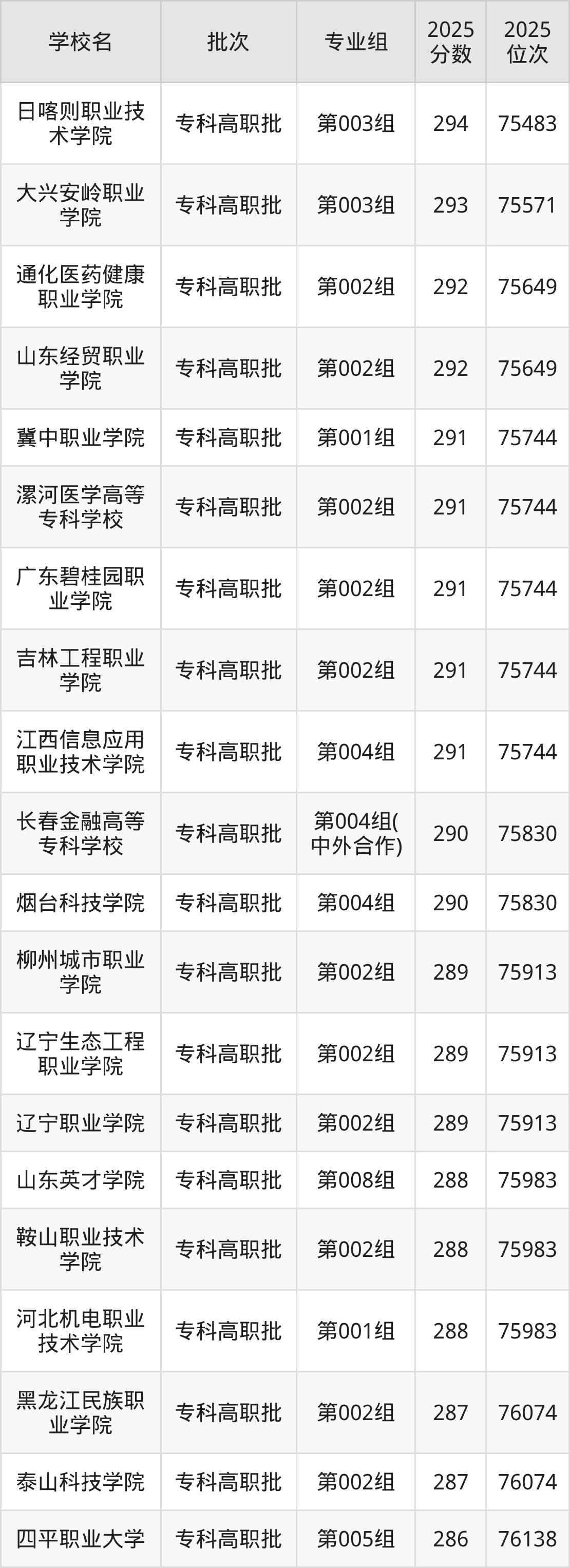 2025年吉林高考物理类289分(75831名~75913名)能上的大学有辽宁职业学院第002组、辽宁生态工程职业学院第002组、柳州城市职业学院第002组。
