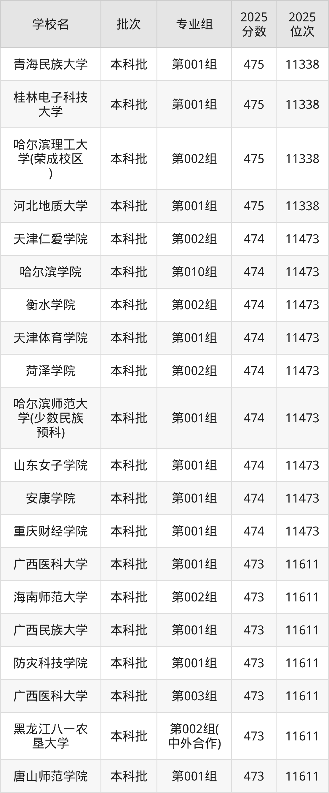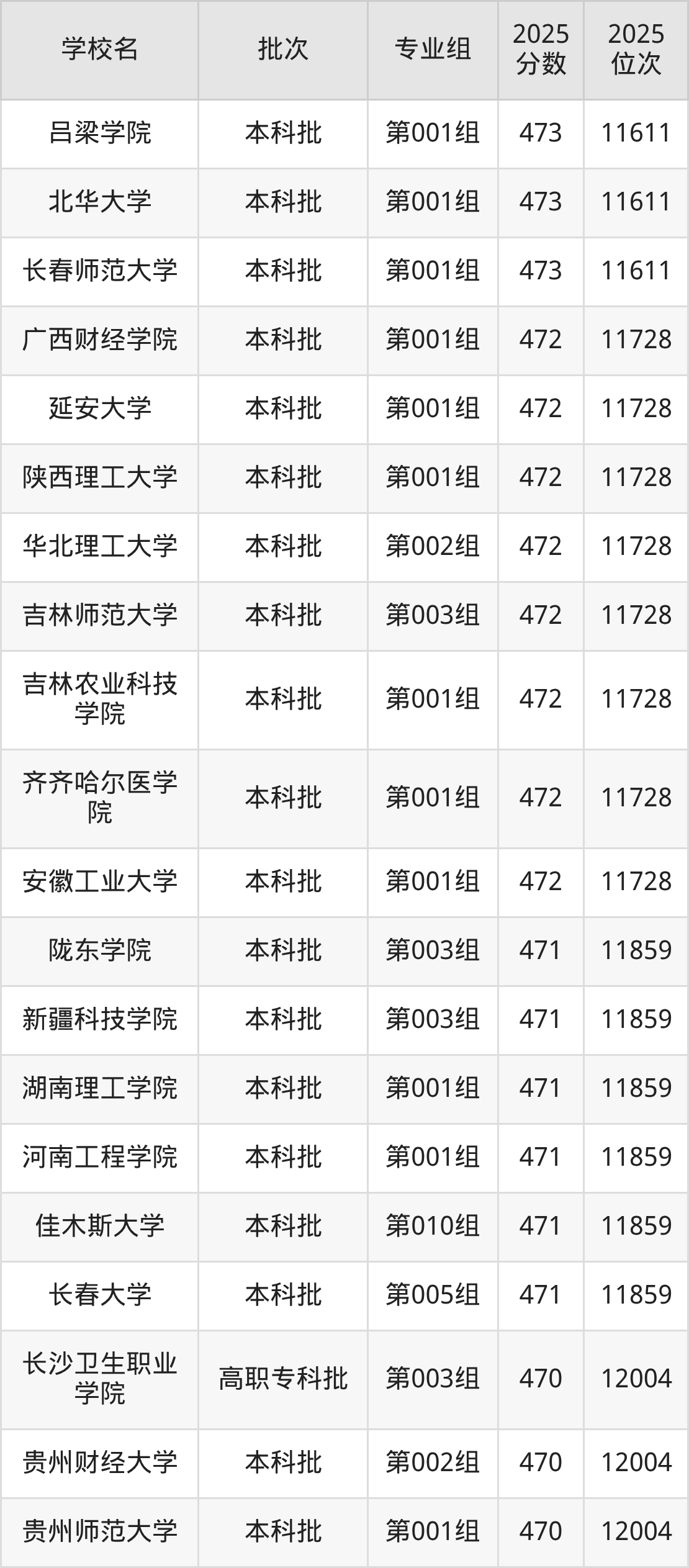 2025年黑龙江高考历史类471分(11729名~11859名)能上的大学有长春大学第005组、佳木斯大学第010组、河南工程学院第001组、湖南理工学院第001组等。
