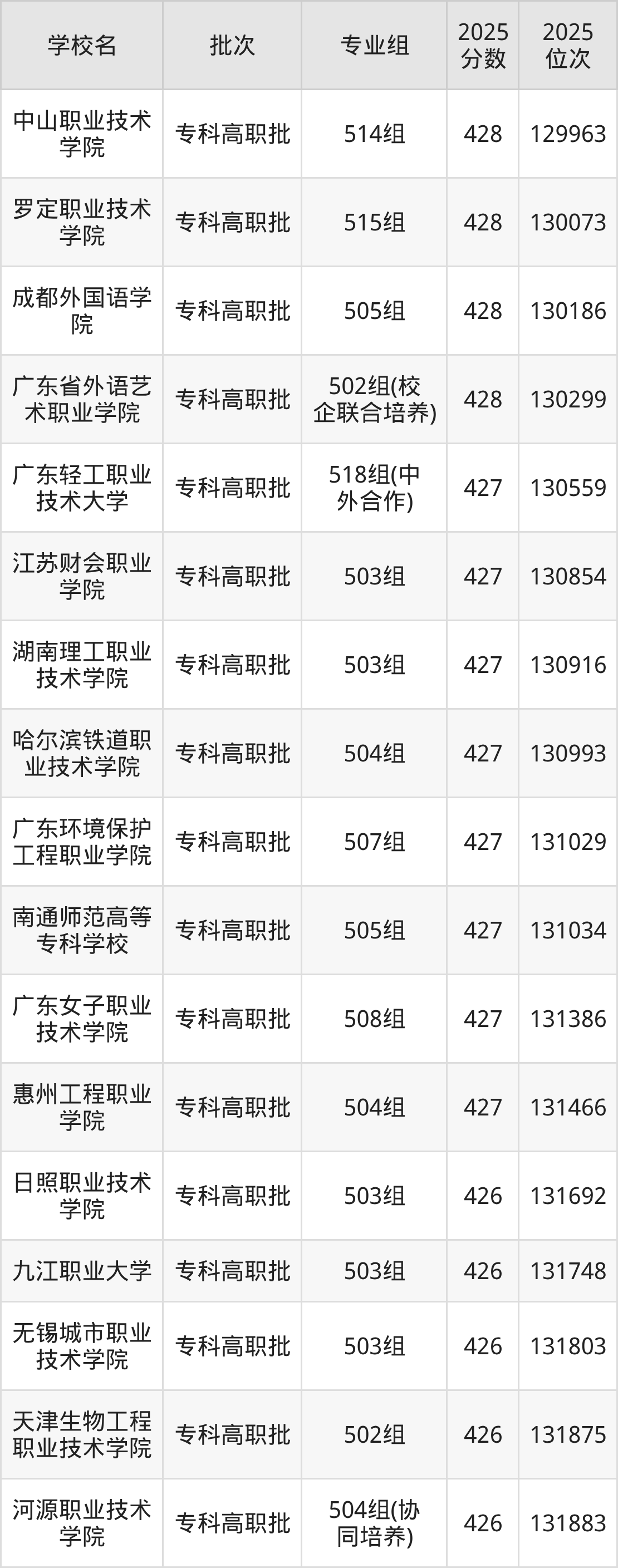 2025年广东高考历史类427分(130332名~131456名)能上的大学有广东轻工职业技术大学518组(中外合作)、广东女子职业技术学院508组、哈尔滨铁道职业技术学院504组、湖南理工职业技术学院503组等。