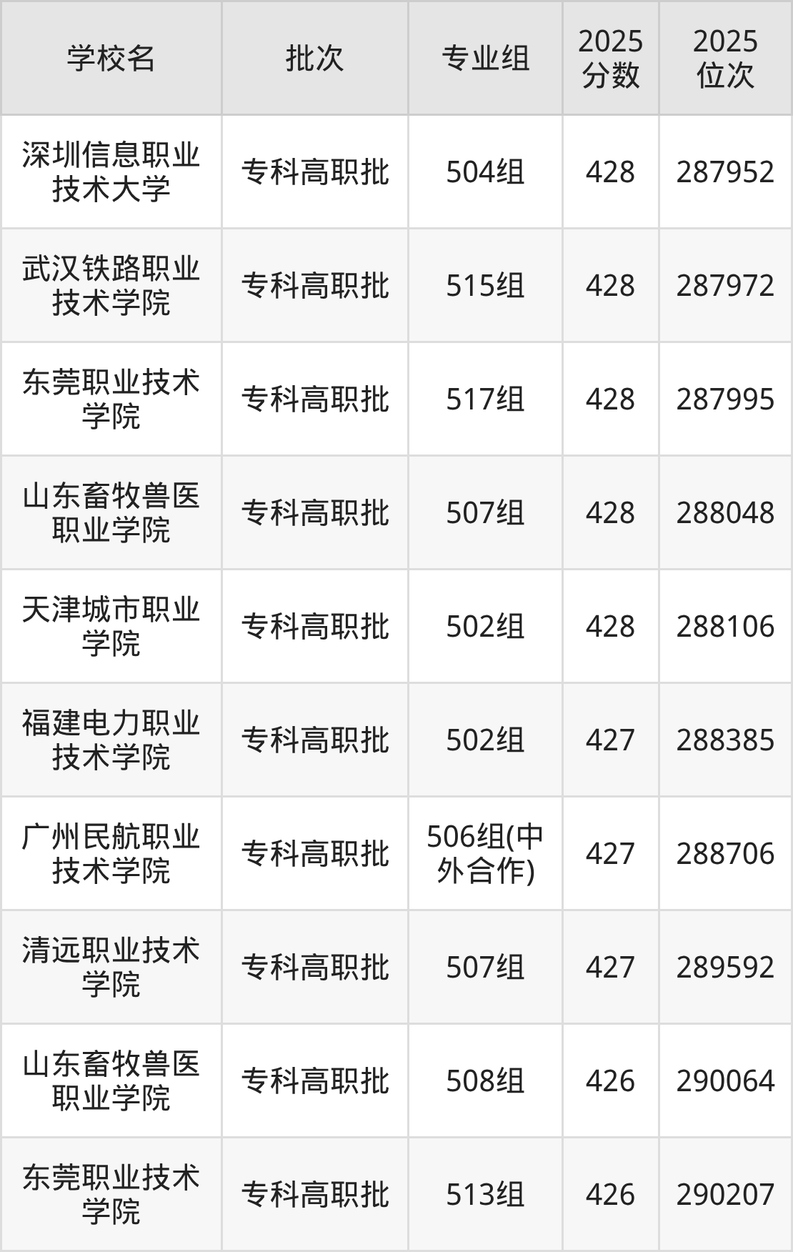 另外录取位次低于该区间(较稳妥)的有山东畜牧兽医职业学院508组(290064名)、东莞职业技术学院513组(290207名)等;录取位次高于该区间(可冲)的有天津城市职业学院502组(288106名)、山东畜牧兽医职业学院507组(288048名)等。