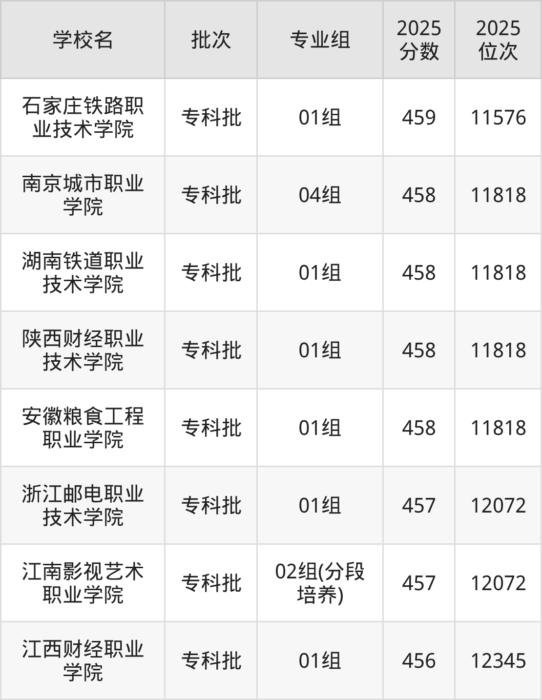 2025年江苏高考历史类457分(11819名~12072名)能上的大学有江南影视艺术职业学院02组(分段培养)、浙江邮电职业技术学院01组。
