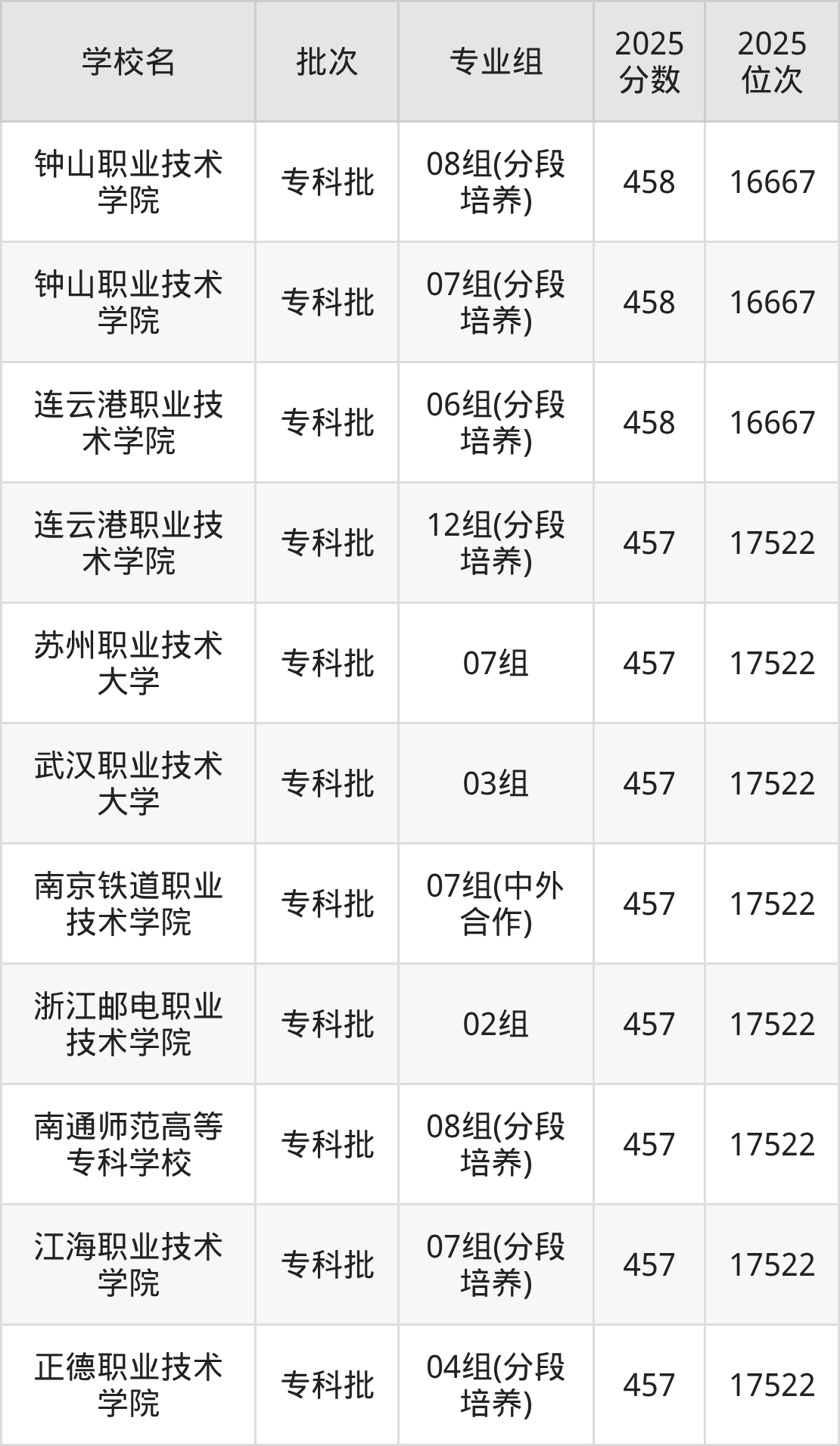 2025年江苏高考物理类457分(16668名~17522名)能上的大学有南京铁道职业技术学院07组(中外合作)、苏州职业技术大学07组、南通师范高等专科学校08组(分段培养)、连云港职业技术学院12组(分段培养)等。