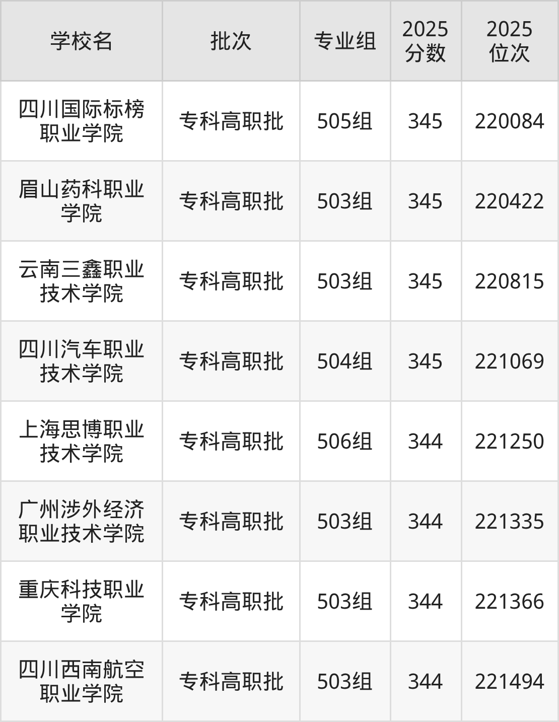2025年广东高考历史类345分(220052名~221059名)能上的大学有四川国际标榜职业学院505组、云南三鑫职业技术学院503组、四川汽车职业技术学院504组、眉山药科职业学院503组。